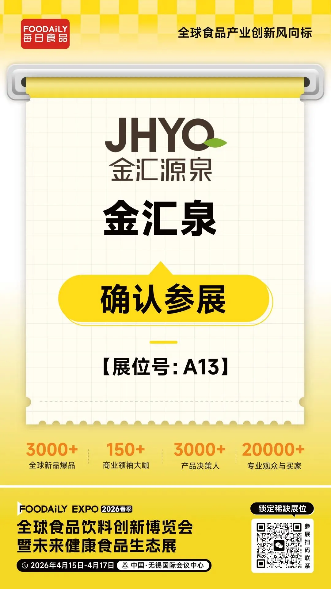 2026 Foodaily创新博览会,金汇泉将携旗下明星产品亮相无锡国际会议中心,A13展位,诚邀邀业界同仁品鉴交流,共探健康饮品创新新趋势!