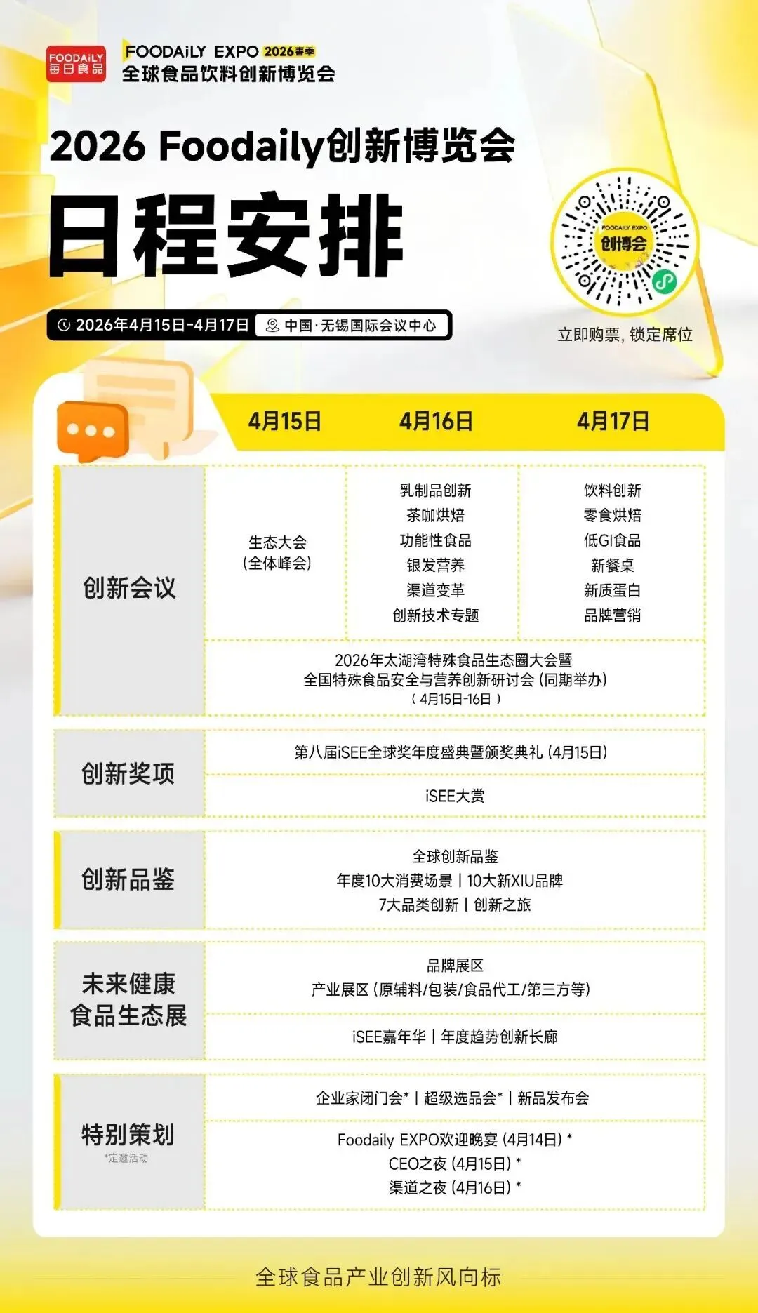4月15日-17日,2026 Foodaily创新博览会将深度融合产业顶层思想、全球创新灵感与标杆品牌实践案例,以“创新会议+创新品鉴+创新奖项”以及“未来健康食品生态展”为核心载体,为参会者呈现全球视野下的食品健康化、功能化系统升级全景图。