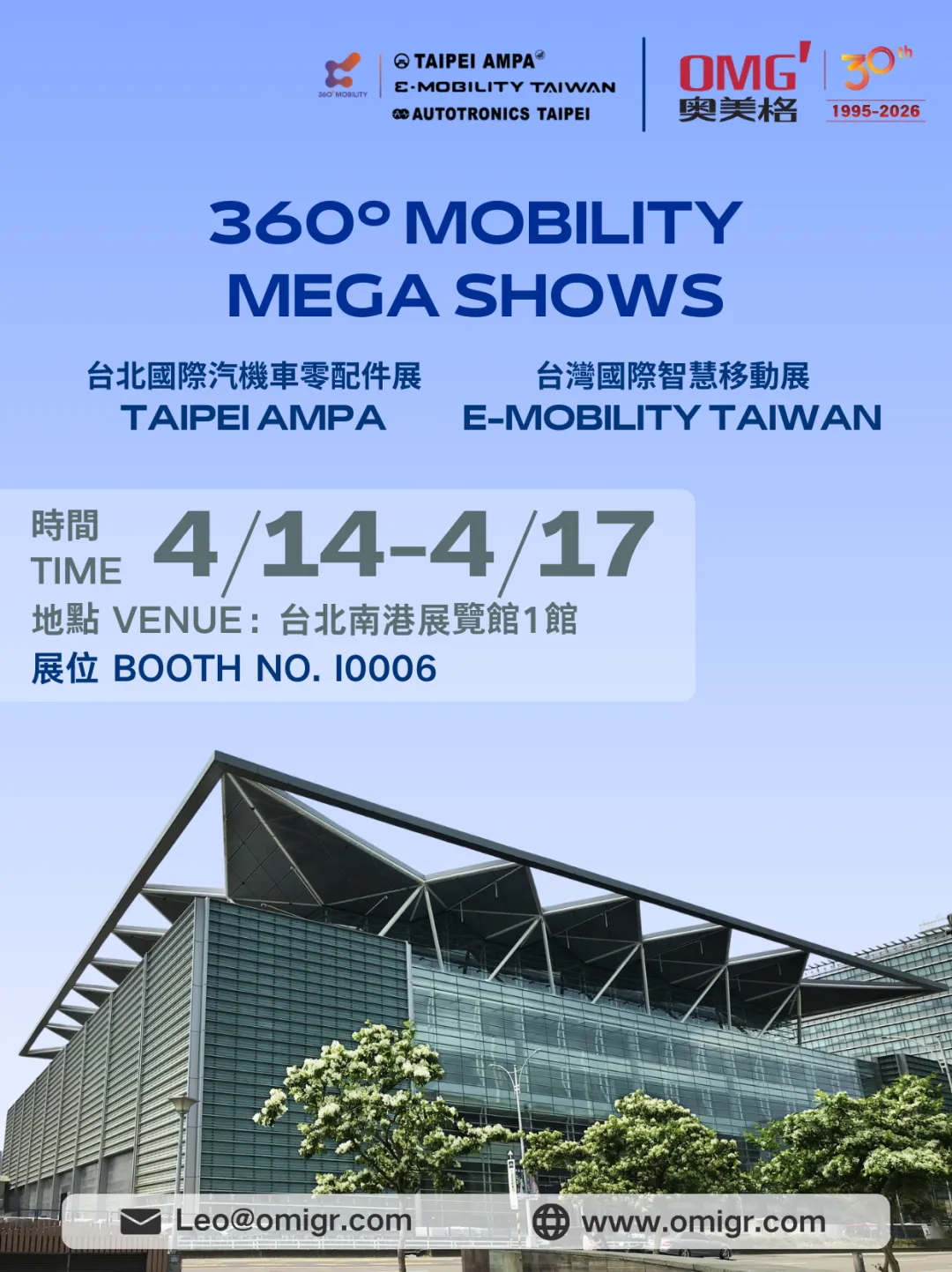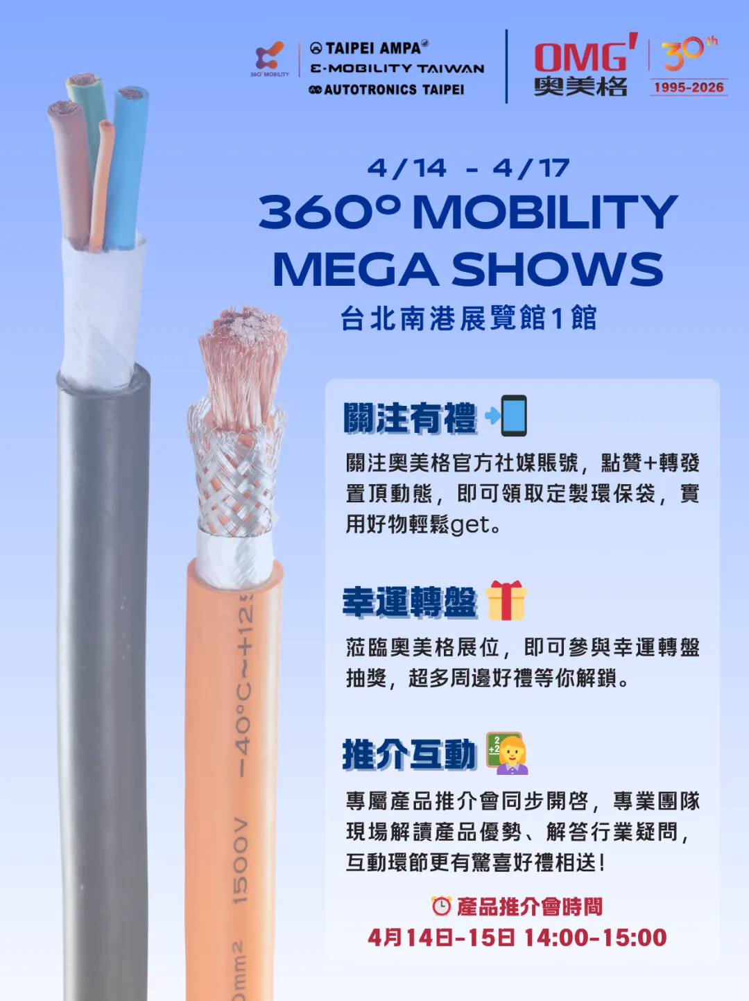 360°MOBILITY Mega Shows 汇聚三大行业展会,贯通零部件、车用电子、电动化与智慧移动等全产业链。奥美格携新能源线缆核心产品亮相,诚邀各界伙伴莅临展位,共探商机、共筑未来!