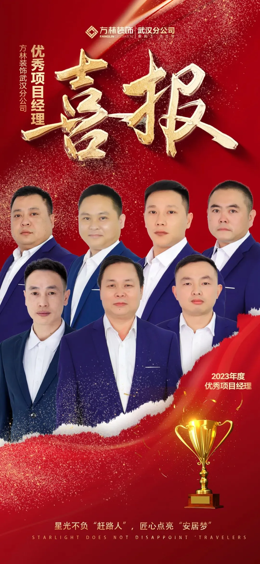 武汉方林装饰始终将人才培养与发展视为企业持续壮大的基石,积极搭建人才成长平台。在此次评选中,我司『陈炳南、董结朋、何磊、何祝明、贾国平、江红、叶志刚』经过层层选拔,脱颖而出,荣获“优秀项目经理”称号。