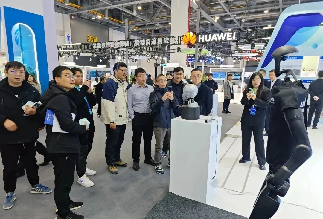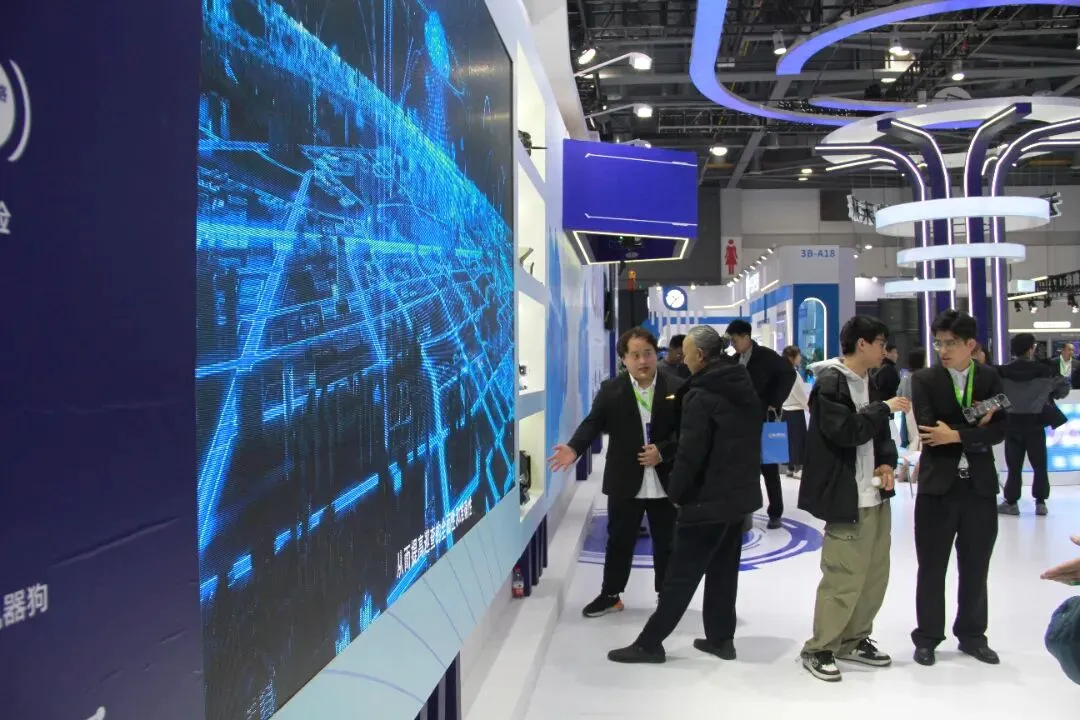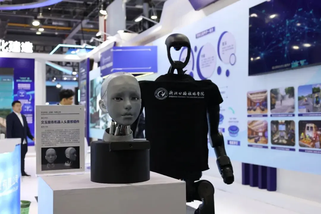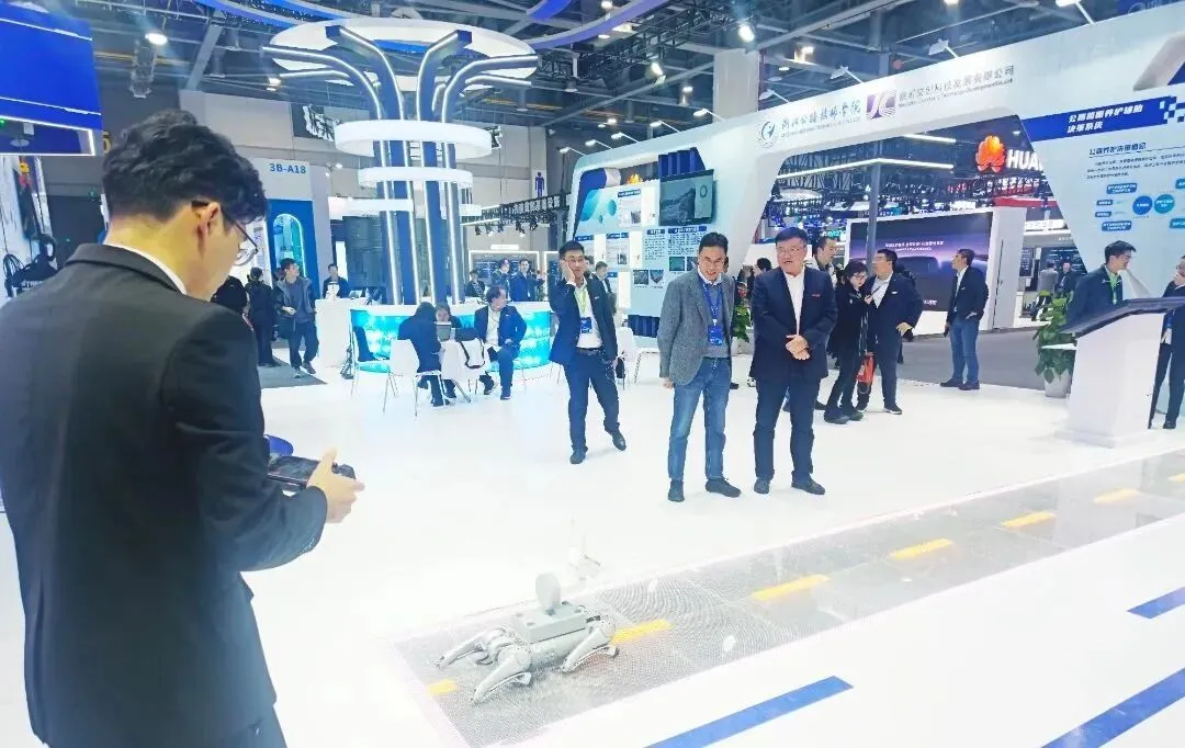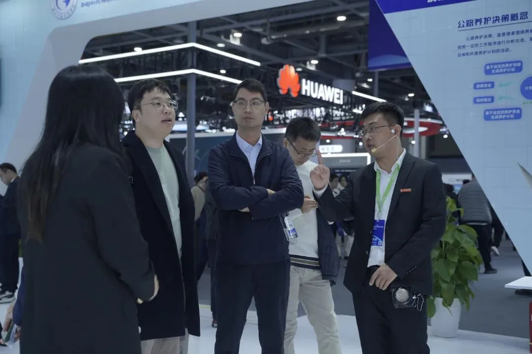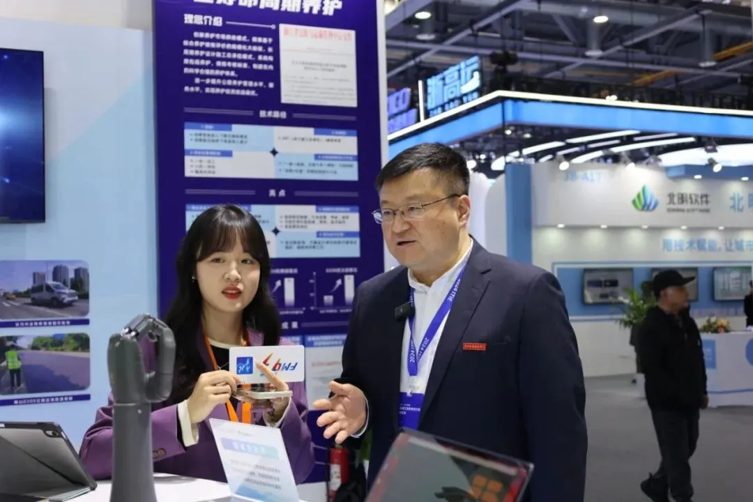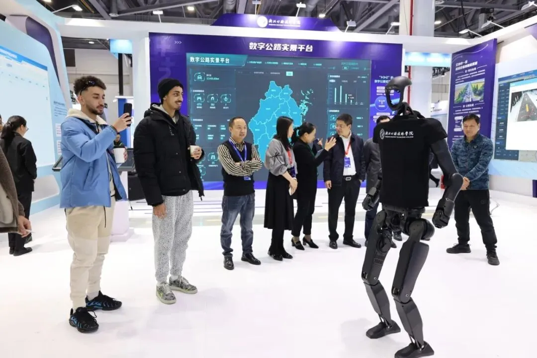 展会首日,学院与公司展区人气火热。人形机器人、情感交互服务机器人、智能仿生手、脑环等高科技装备,吸引了大量嘉宾和观众驻足参观和互动。他们表现出浓厚的兴趣,积极与讲解员沟通交流,详细了解各类产品的性能特点与应用场景。在现场试验路段,机器狗搭载轻量化巡检设备忙碌工作,参观者亲身体验智慧养护体验区的互动演示,通过大数据分析平台和现场大屏,近距离观察试验检测与病害数据实时生成的过程,深入了解了学院和交创公司在公路养护管理方面的最新成果。