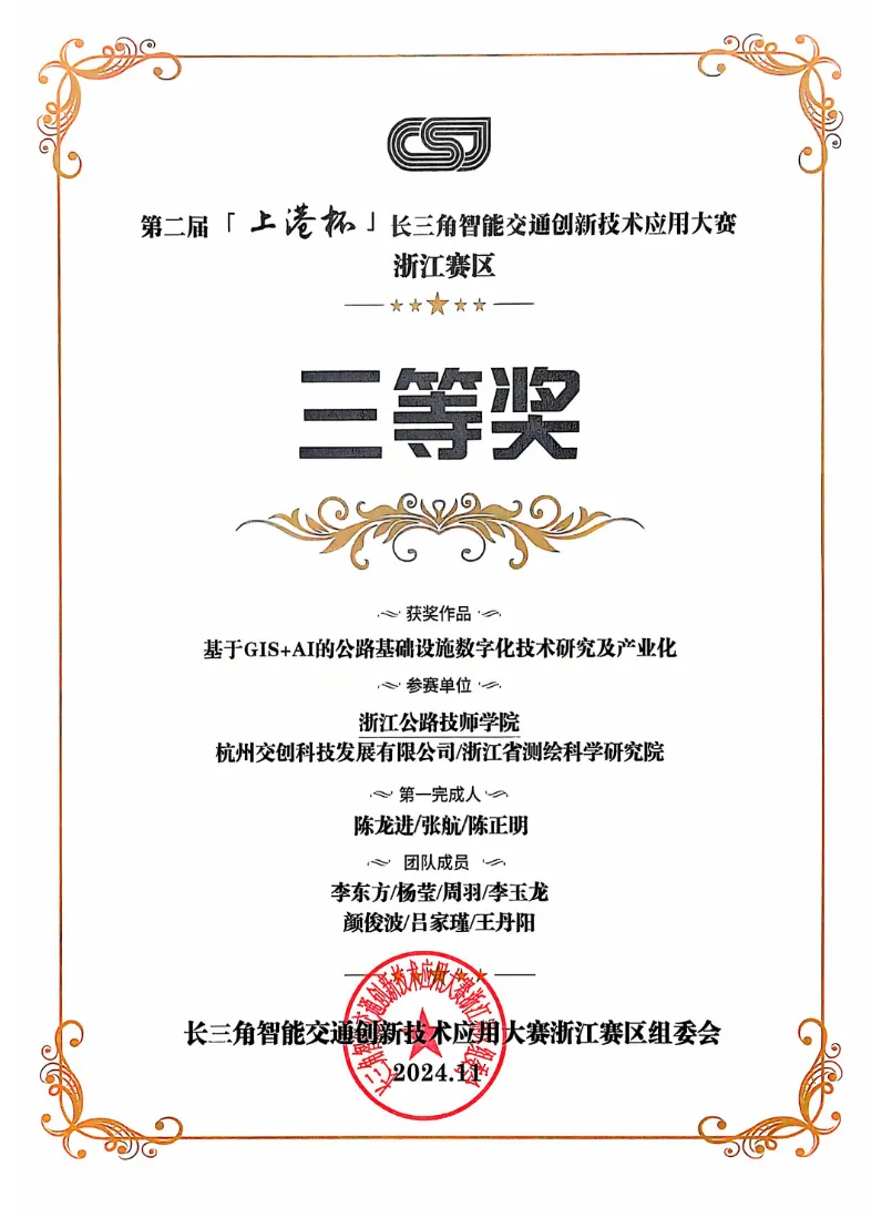 学院展区当日接待访客数量突破200人次,并在开幕会上举行的长三角智能交通创新技术应用大赛(浙江赛区)颁奖仪式上,凭借《基于GIS+AI的公路基础设施数字化技术研究及产业化》项目荣获三等奖,这充分展示了行业内外对学院和公司科研成果的高度认可。