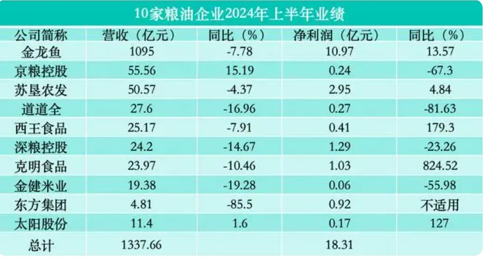 引人注目的是,主营大米的东方集团在2022年、2023年连续两年亏损的情况下,于上半年扭亏为盈,实现净利润0.92亿元。同时,专注于玉米油市场的西王食品也在上半年实现盈利,实现营收25.17亿元,净利润4100万元,同比增加179.3%,成功扭转了2023年亏损1686.58万元的颓势。