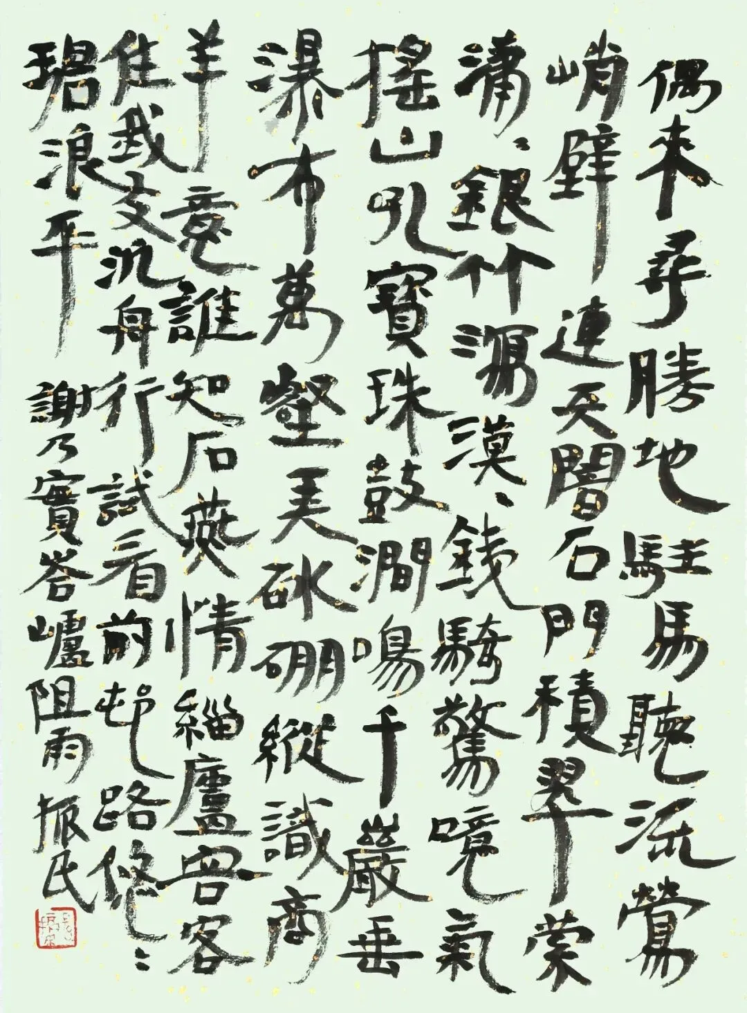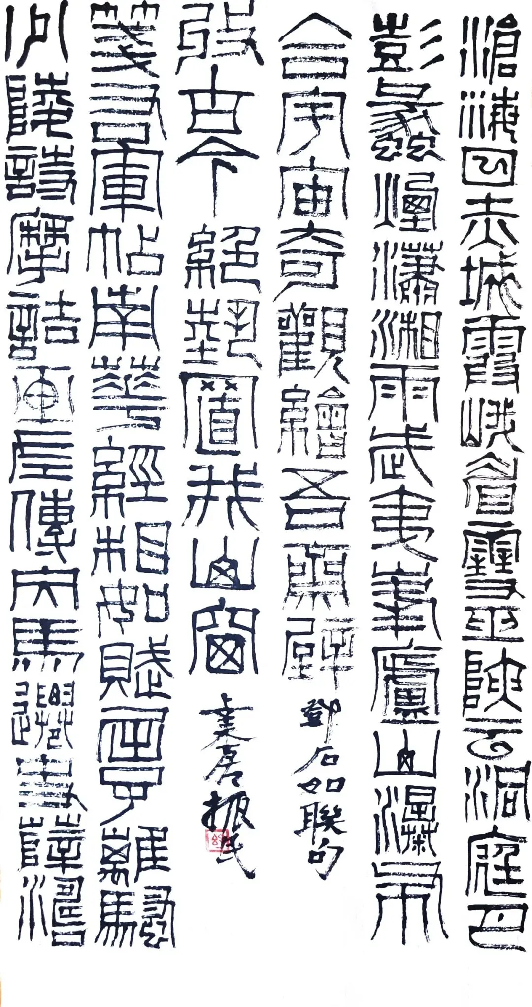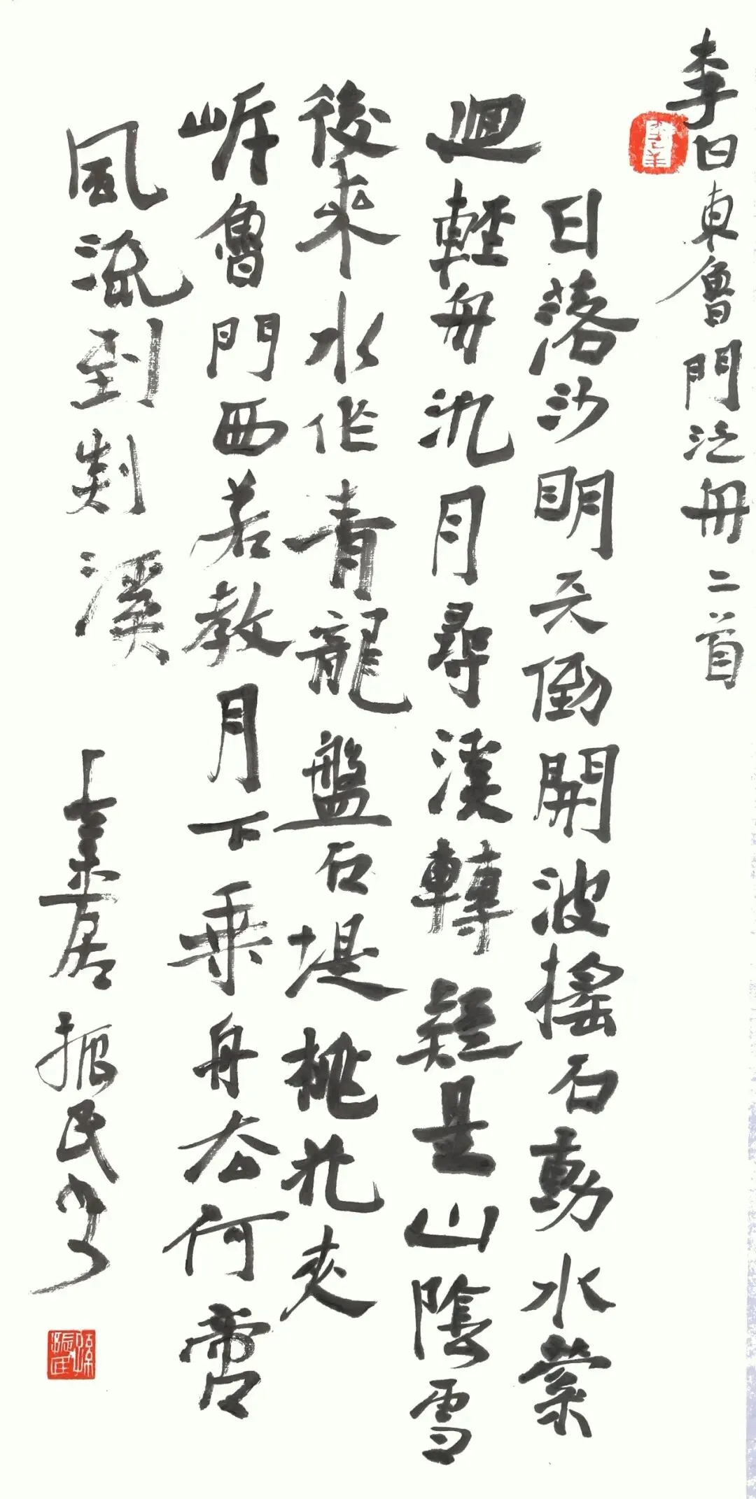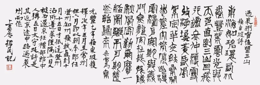 王未先生专攻山水,师法自然,心摹手追,笔下丘壑林泉、烟岚云岫,皆得胶东山海之灵气。其画作格调高逸、意境清远,于笔墨间藏天地之阔,于构图中显人文之厚,将地域山川风骨与传统文人画精神相融,尽显东方山水的诗意与哲思。孙振民先生精研书法,五体皆擅,取法高古,笔力沉雄,书风古雅醇厚、气韵浑朴。线条间见金石气象,墨韵中藏文化底蕴,以篆隶之质承载乡土文辞,让传统书法与地域文化自然融合、互为表里。二人一画一书,一景一文,笔墨联缘,相得益彰,以艺术实践诠释对传统文化的坚守与对家乡热土的深情。