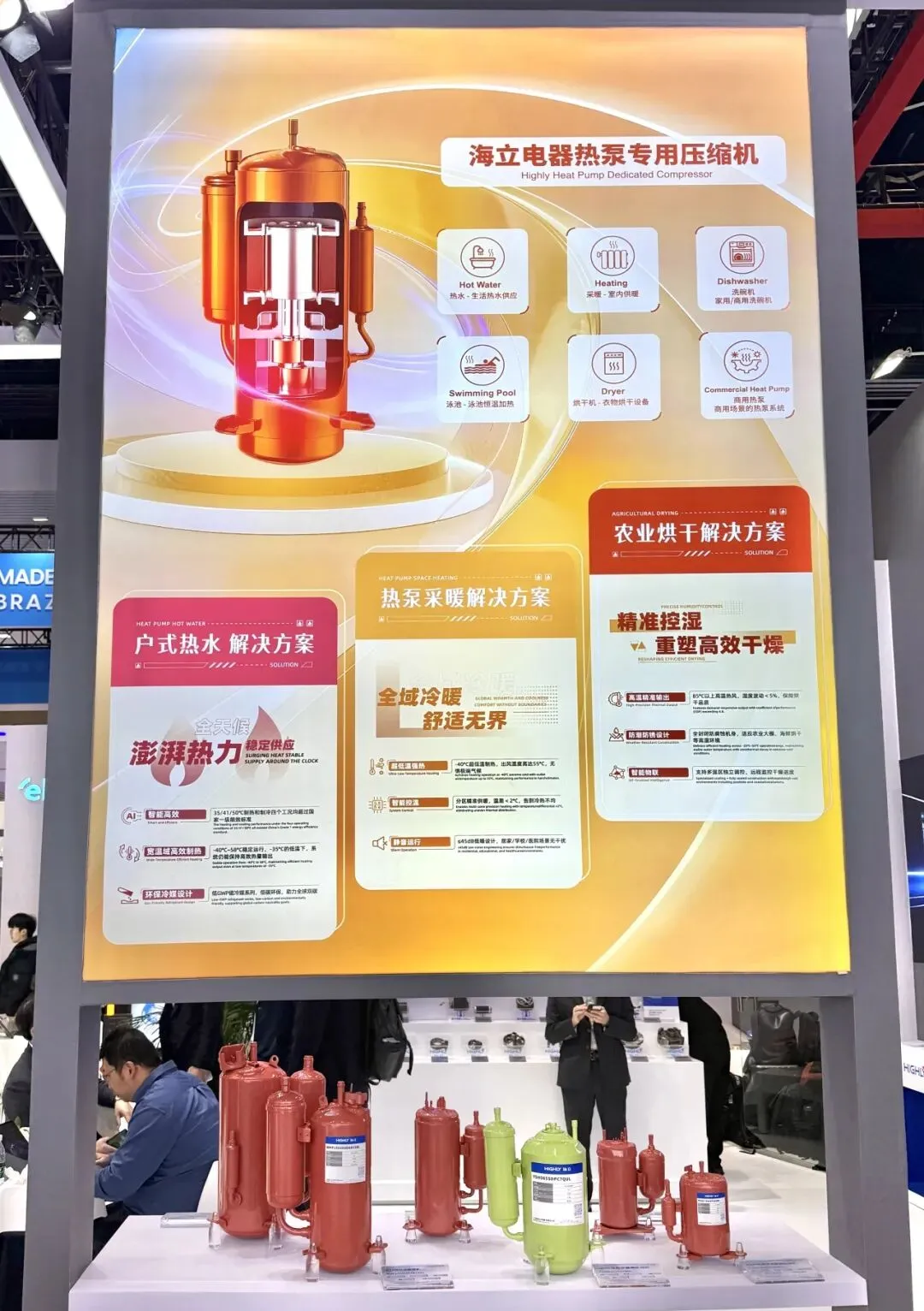 除25HP超大规格产品外,海立电器还集中展示了家用及轻商变频系列(R32/R290环保冷媒、超一级能效)、热泵专用系列(-40℃超低温、喷气增焓)以及小型商用及冷链系列(4-10HP转子压缩机,适用便利店、冷库等场景),充分体现了其在转子式压缩机领域的技术纵深与一站式配套能力。