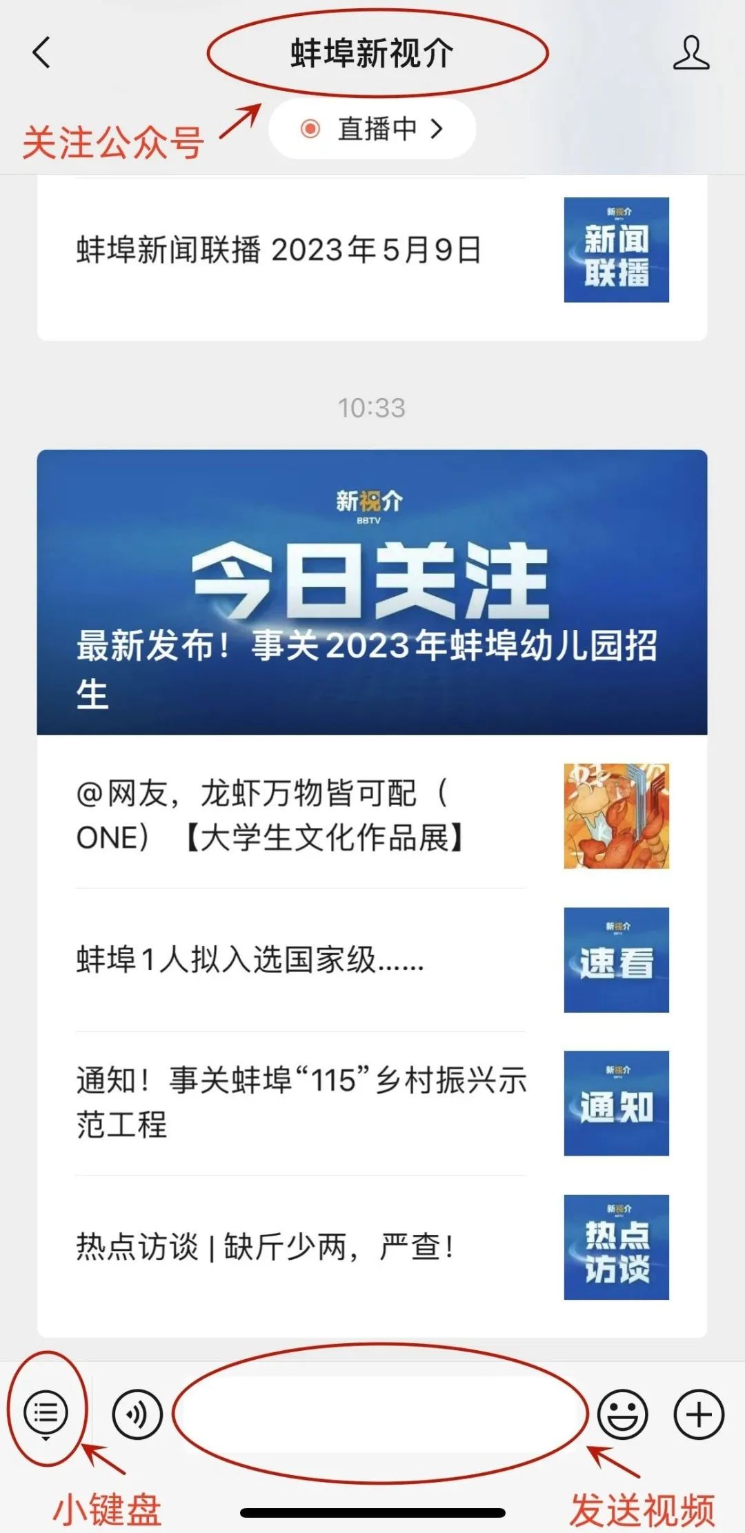 2)关注“蚌埠新视介”,点击下方小键盘和“+”号,直接发送视频。