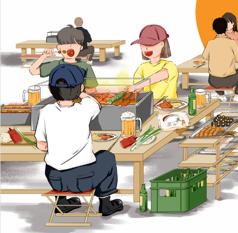 露天、炭火、熏烟、鲜肉、啤酒、老友和夏天。