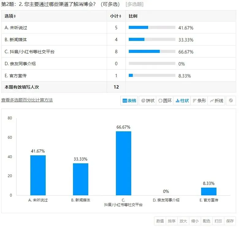 2. 官方宣传渗透力薄弱:仅8.33%受访者通过官方宣传知晓消博会,说明官方宣传的覆盖面、传播力、吸引力不足,未有效打通大众传播链路。