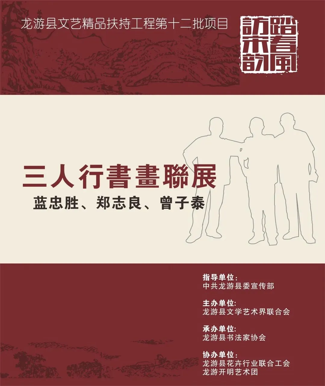 三人年岁相若,以书画相交数十载,暇时常相约于山间、案头,探辩切磋。蓝忠胜先生浸淫书法卅年有余,尤以王铎行书及魏晋小楷多有研习,多年来致力于书艺普及传播,桃李天下;郑志良先生真行隶篆草诸体皆善,并以篆刻见长;曾子泰先生作品关注时下风物题材,以大写意之法饱笔纵墨,呈现沉郁朴茂、悠远之思的独特韵味。三人筹此展四月余,今予以展示,以此为“4.23”世界读书日活动奉上一道小礼。