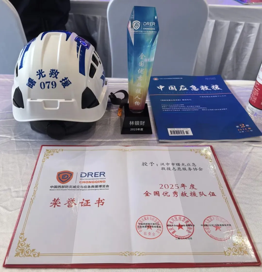 本次会议上汉中市曙光应急救援志愿服务协会和会长林一帆同志双双获评“2025年度全国优秀应急救援队伍”和“2025年度全国优秀应急救援人物”奖项。