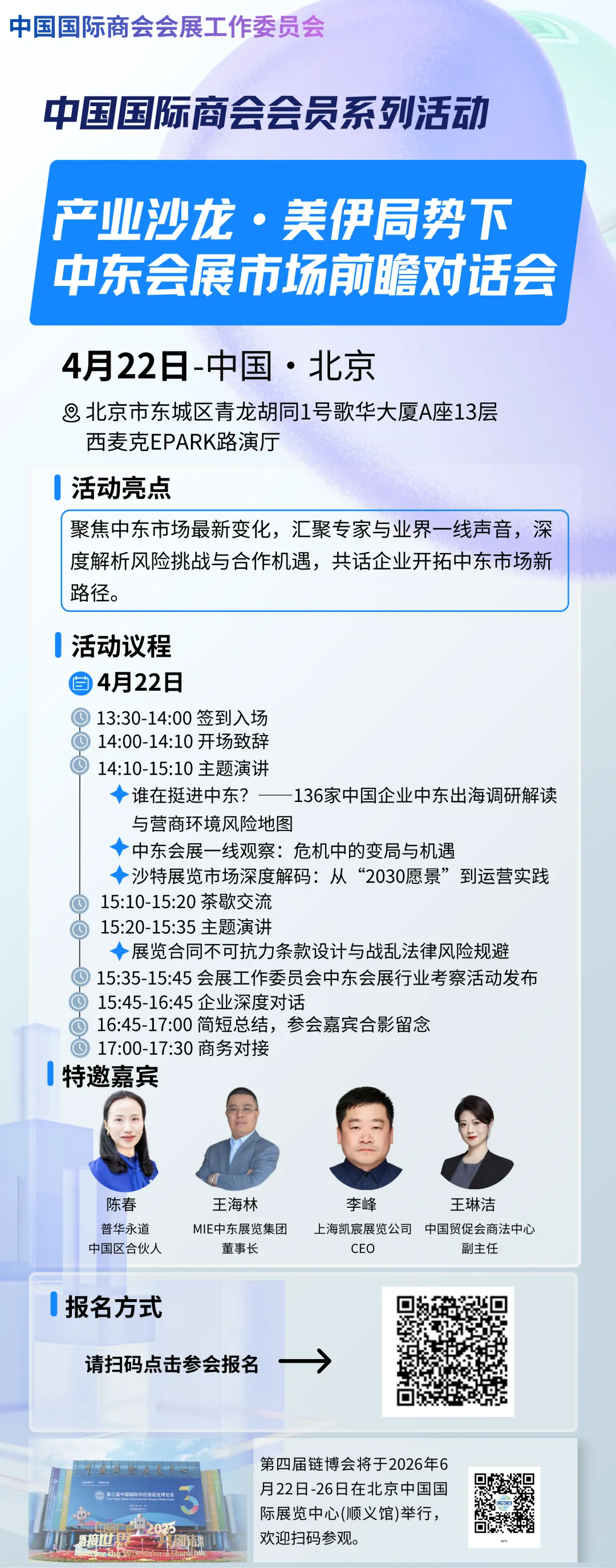 4月22日,中国国际商会会员系列活动——“产业沙龙·美伊局势下中东会展市场前瞻对话会”将于北京举办。四位来自各行业的嘉宾将分别从营商环境、市场一线、长期实战和法律风控四个维度,带来对中东市场的深入解读。