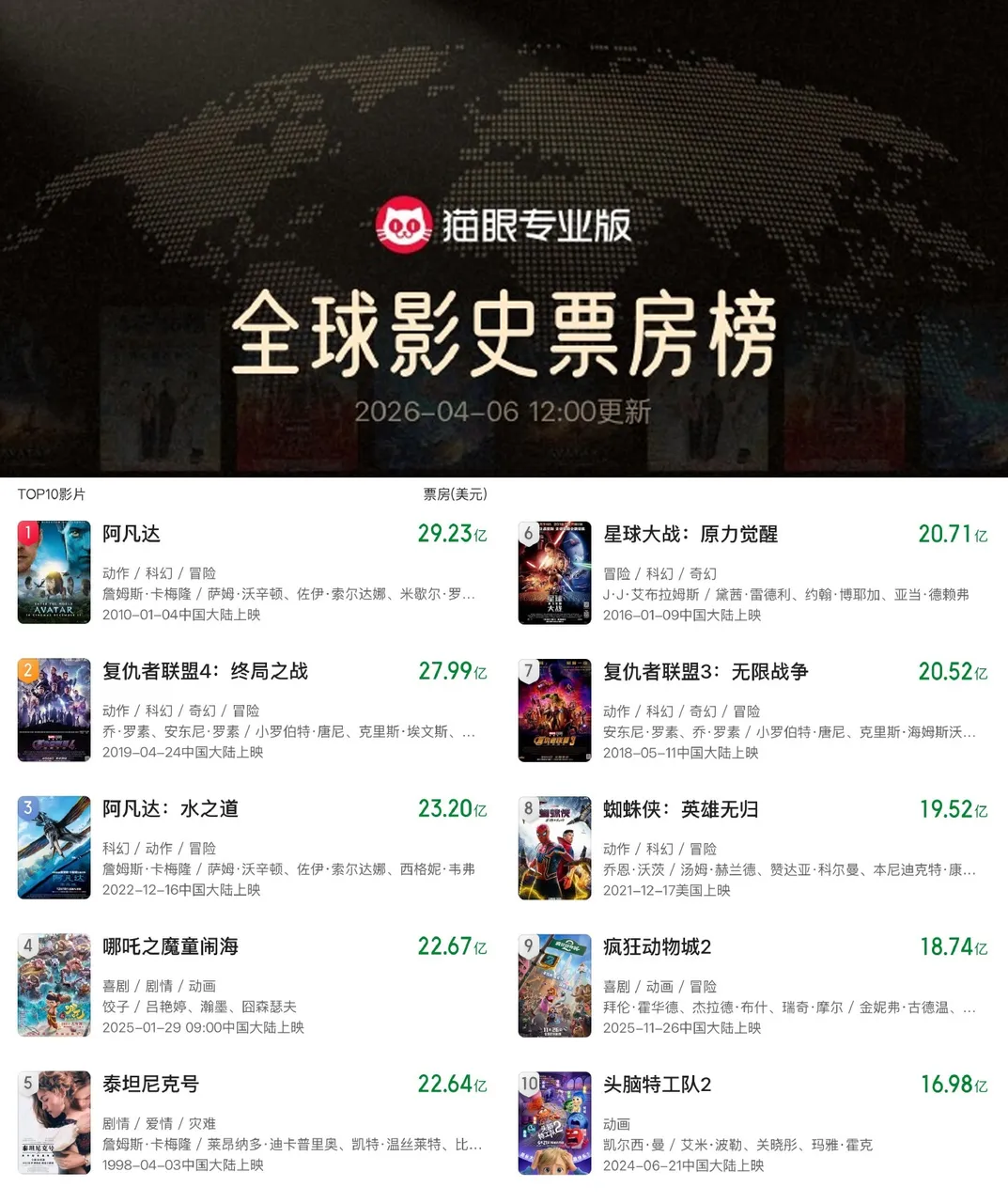 此次排名跃升,主要受海外票房补录、海外市场持续上映及汇率变动等因素影响。权威平台近期完成该片在马来西亚等地区的票房数据补录,叠加影片在韩国、东南亚等地的长尾放映,共同推动总票房走高。作为全球影史票房榜前十中唯一一部亚洲影片、唯一一部非好莱坞制作的影片,这一成绩标志着中国动画与国产电影在全球市场实现历史性突破。