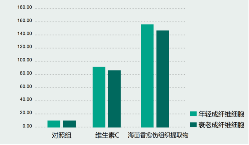 多项数据表明,海茴香愈伤组织细胞中的胜肽、多酚等功能成分可以有效激活皮肤真皮层中的成纤维细胞,促进胶原蛋白、弹性蛋白分泌, 修护老化受损的胶原纤维网络。实验证实,使用海茴香愈伤组织提取物护理肌肤三周后, 成纤维细胞的细胞代谢率提升高达10倍。与常用抗老成分维生素C相比,海茴香愈伤组织提取物激活成纤维细胞的功效高出1.6倍。
