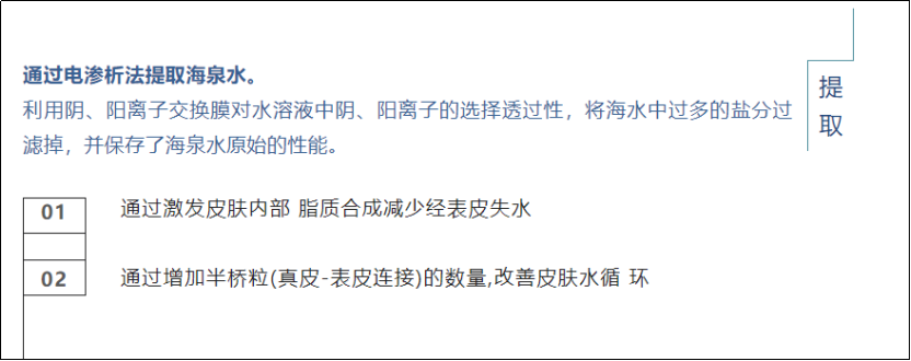 尚纯海洋精粹系列的主打成分之一就是布列塔尼半岛的深层海泉水,我们通过电渗析法,利用阴、阳离子交换膜对水溶液中阴、阳离子的选择透过性,将海水中过多的盐分过滤掉,并保存了海泉水原始的性能。这种天然水相比其他水分,更容易被人体皮肤接受和吸收,堪称皮肤的“完美保湿液”,可让角质层长时间保持最完美的水分比例。