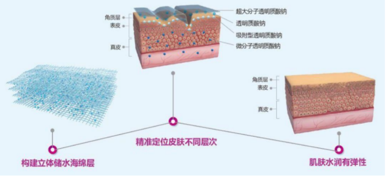 根据玻尿酸的一种分子形态,每一种的分子大小渗入肌肤的能力不同功效也不同,大分子在皮肤表面形成一个锁水薄膜,防止水分流失;中分子渗入到真皮层,提高肌肤的持水力,长效保湿;小分子可以快速深入肌底,深层补水,并且可以促进皮肤代谢,还原皮肤弹力有光泽。