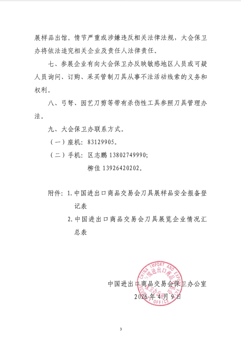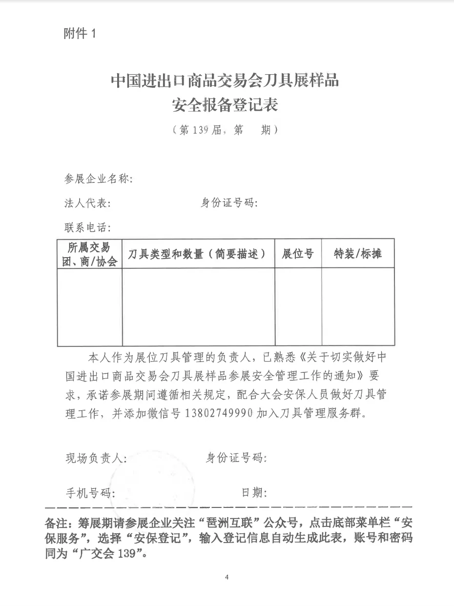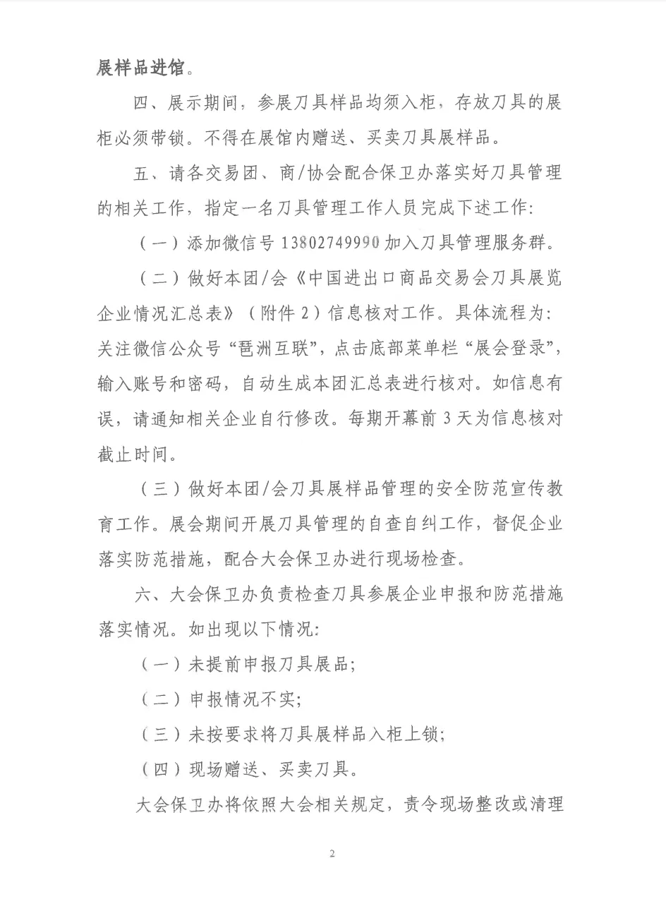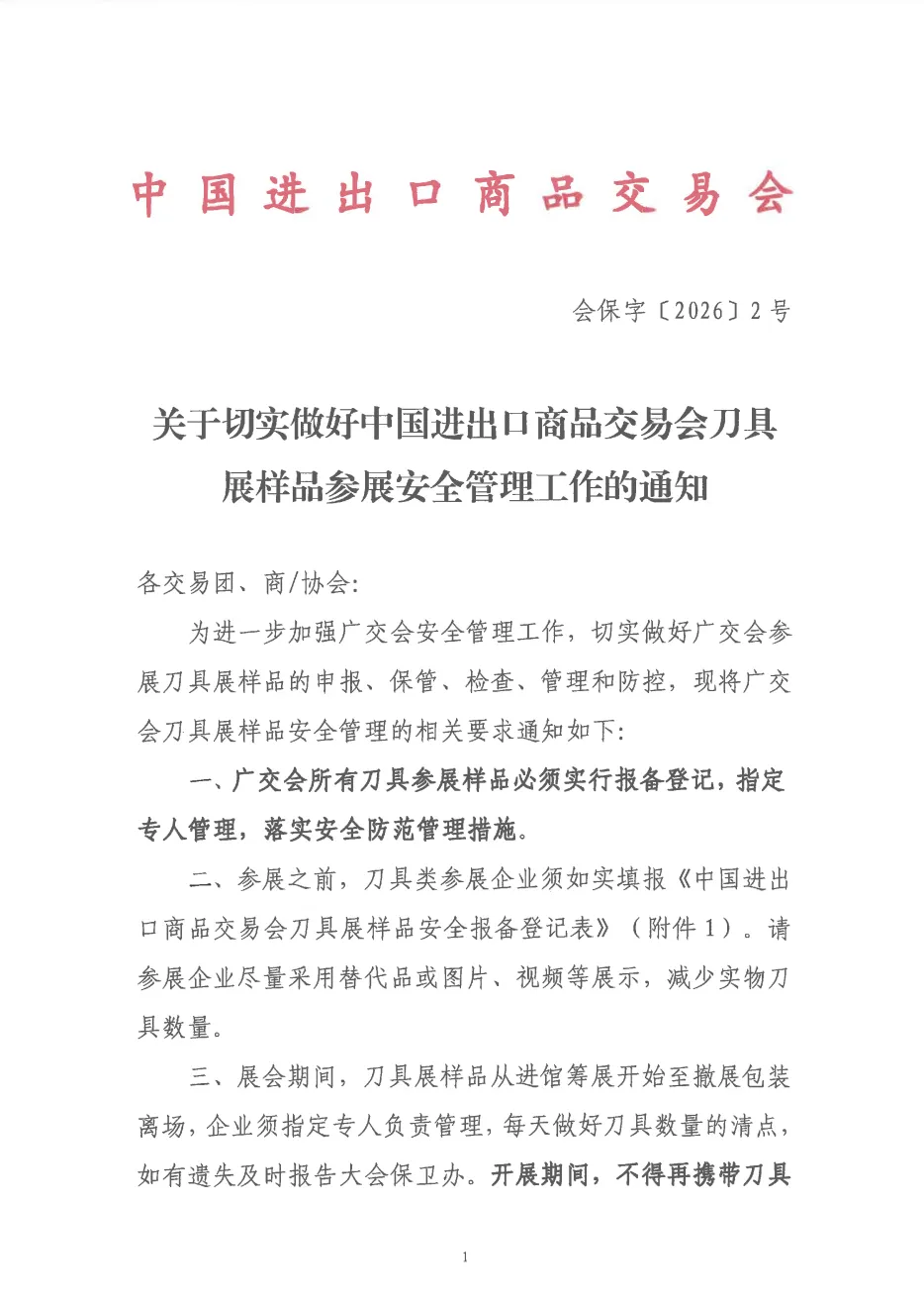 关于切实做好中国进出口商品交易会刀具展样品参展安全管理工作的通知