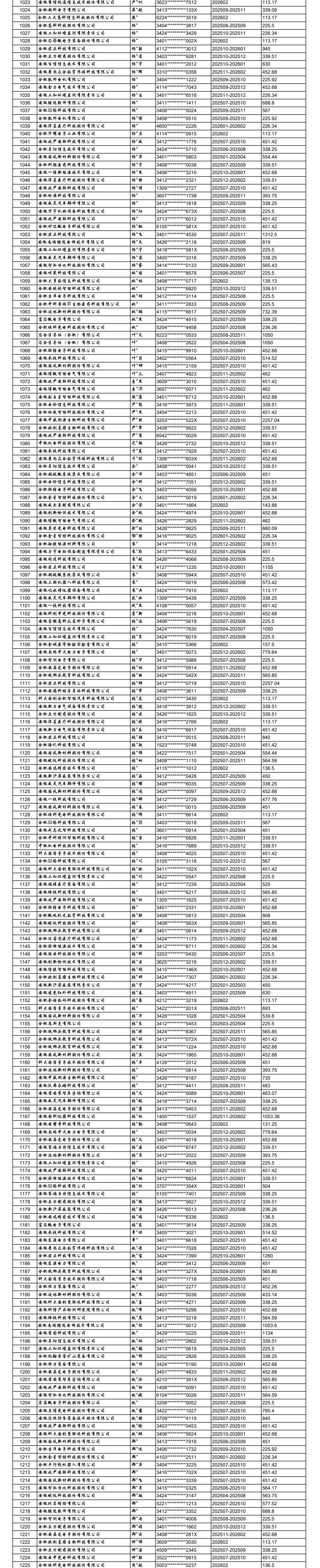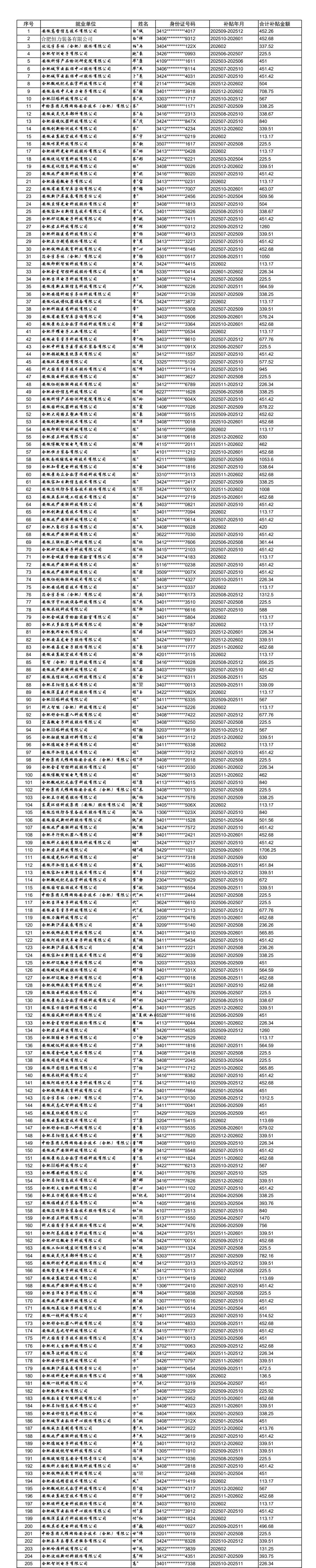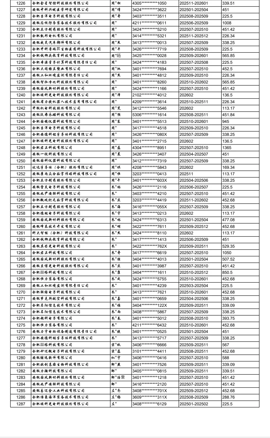 合肥高新区重点行业领域中小微企业社保补贴(第三批)公示表