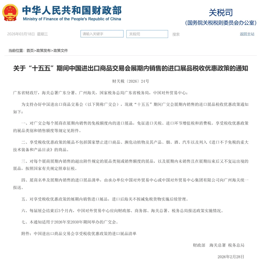 2026年3月5日,财政部、海关总署、税务总局联合发布《关于“十五五”期间中国进出口商品交易会展期内销售的进口展品税收优惠政策的通知》。
