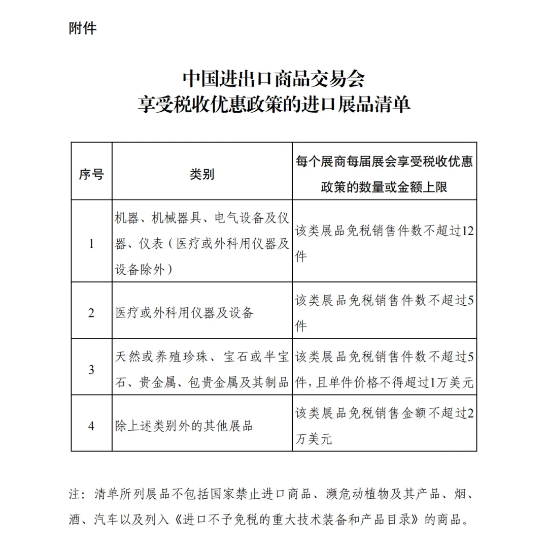 一、对广交会每个展商在展期内销售的免税额度内的进口展品,免征进口关税、进口环节增值税和消费税。享受税收优惠政策的展品类别和销售额度等规定见《财政部 海关总署 税务总局关于“十五五”期间中国进出口商品交易会展期内销售的进口展品税收优惠政策的通知》(财关税〔2026〕24号)附件。