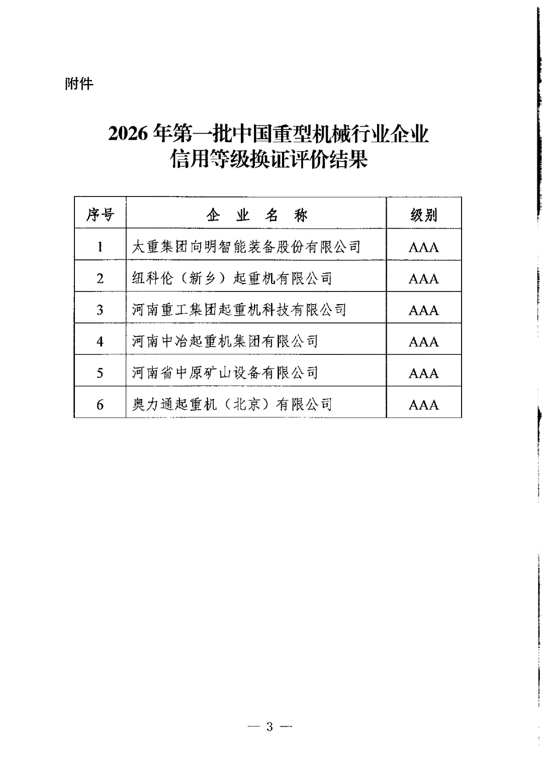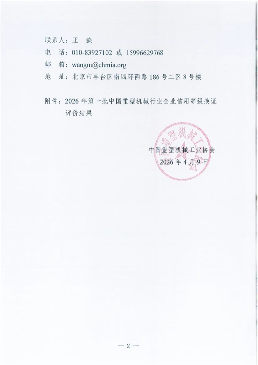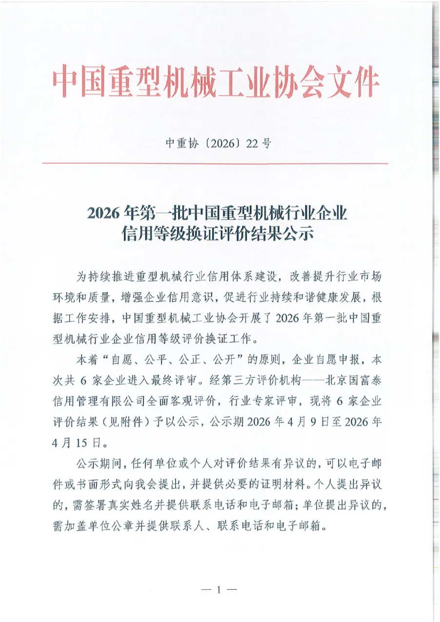 2026年第一批中国重型机械行业企业信用等级换证评价结果公示
