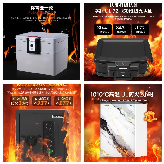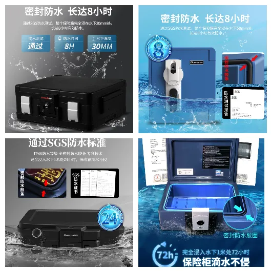 权威认证加持:产品通过美国 UL125 一小时、UL350 半小时/一小时/两小时等多项国际权威防火测试认证,防水性能可达8/24/72小时,全方位守护贵重物品安全。