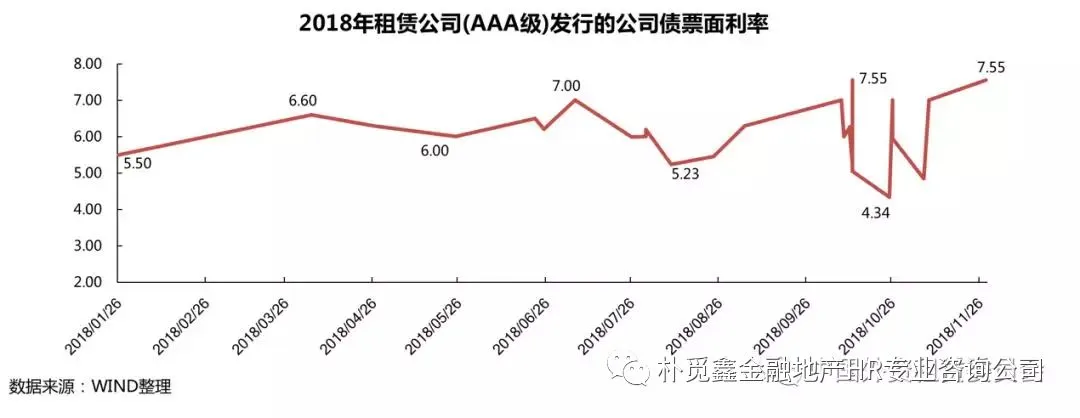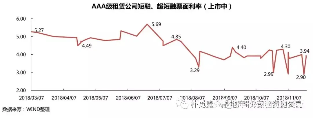 2018年,共有18家租赁公司发行短融、超短融,发行总金额达到851亿元。AAA级租赁公司中,票面利率呈波动下降趋势,自8月后利率维持在4.5%以下,最低低至2.90%(2017年共14家租赁公司发行739.60亿元)。
