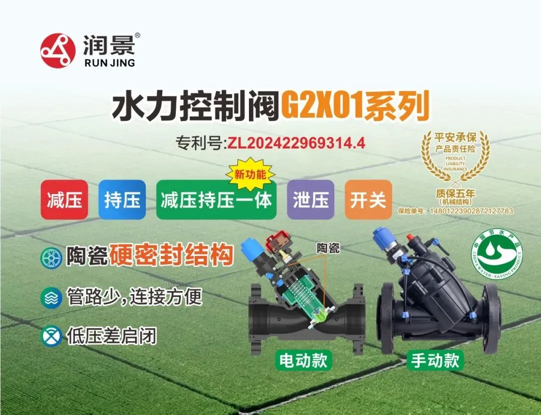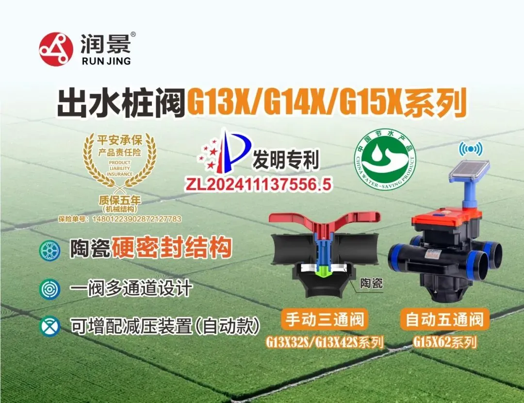 润新公司利用特种陶瓷硬密封技术,开发出润景出水桩阀G13X/G14X/G15X系列(发明专利号:ZL202411137556.5)、水力控制阀G2X01系列(专利号:ZL202422969314.4)、底阀G3001系列(专利号:ZL202422824530.X)等灌溉系列产品,其启闭、换向和流量控制部件采用特种陶瓷材料,具有密封可靠、扭矩轻、耐杂质磨损、耐腐蚀等特点,可用于复杂灌溉水质和环境工况,使用寿命长。