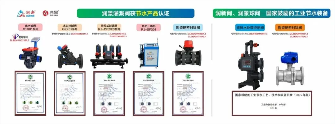 “润新阀”、润景陶瓷硬密封球阀已入选《国家鼓励的工业节水工艺、技术和装备目录》。润景陶瓷硬密封球阀和出水桩阀、水力控制阀等灌溉阀产品通过严格检测,获得节水产品认证证书。