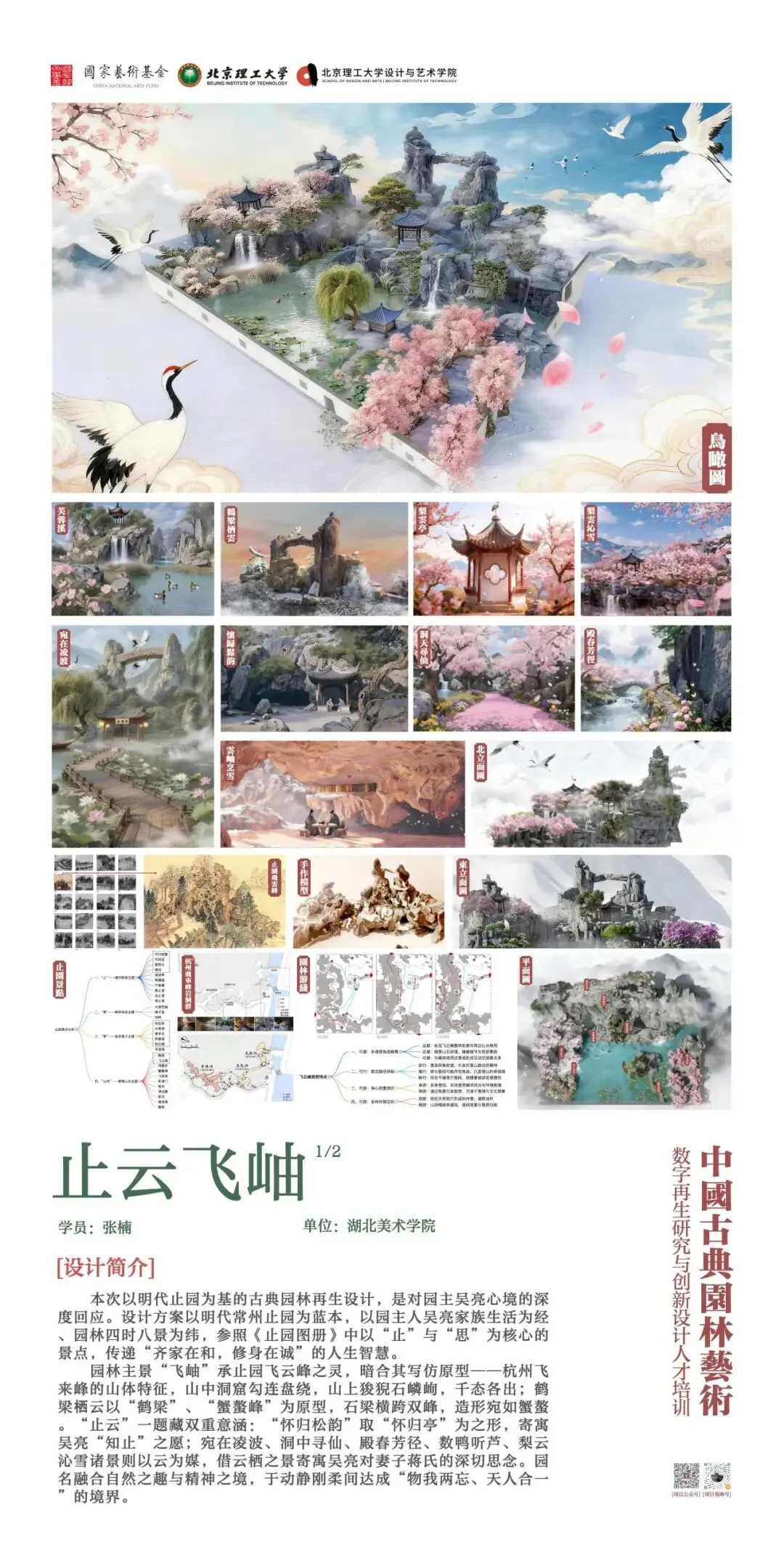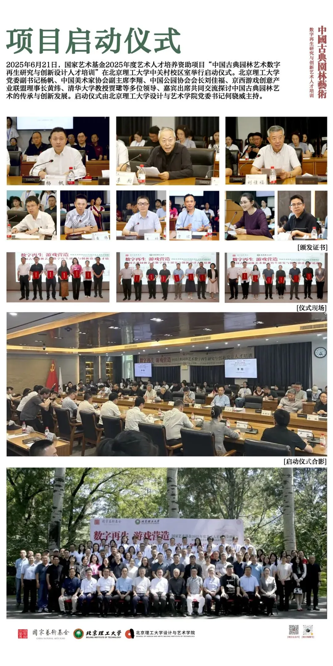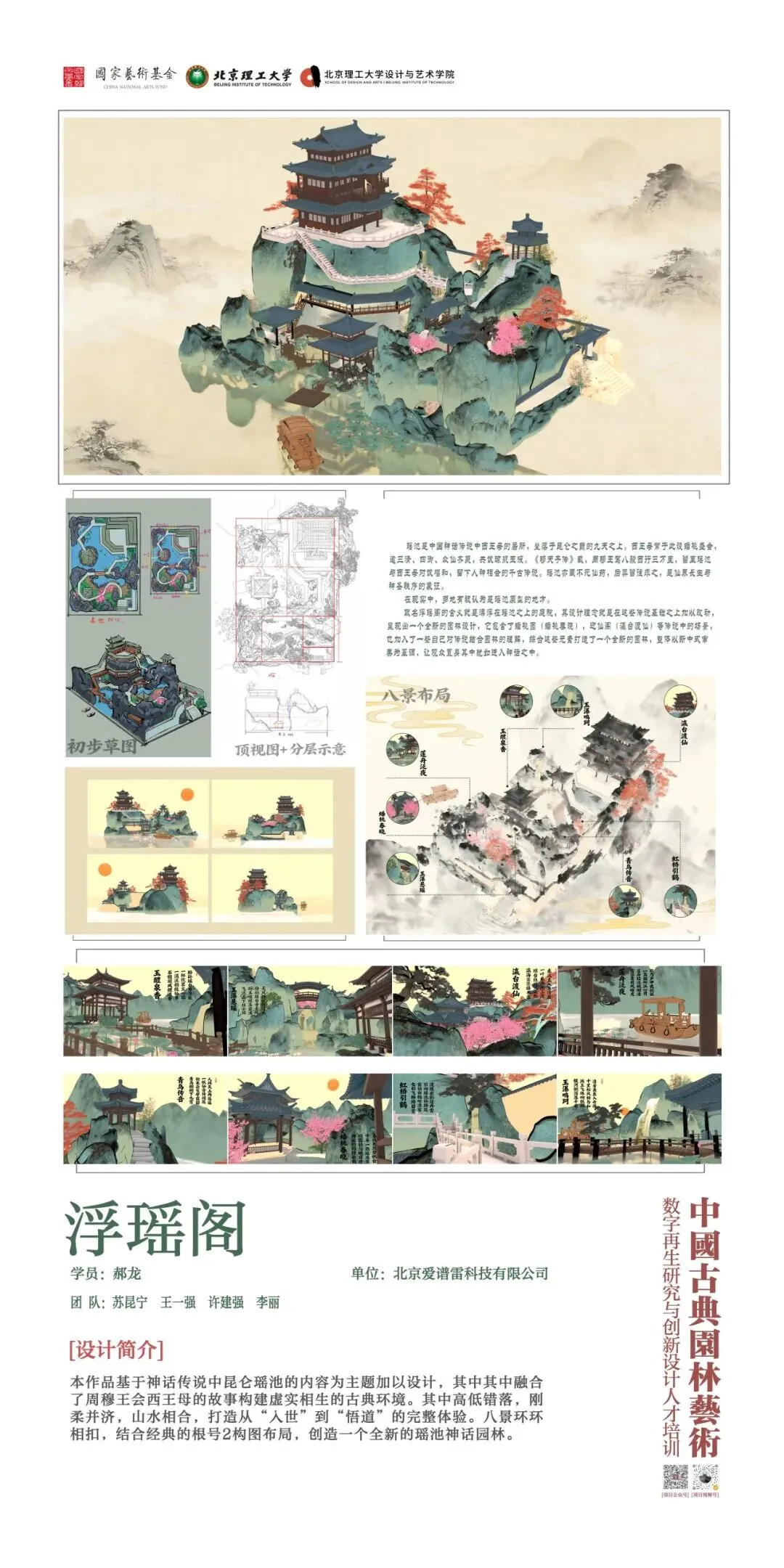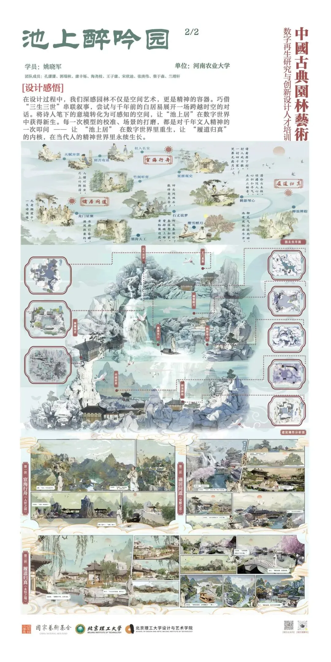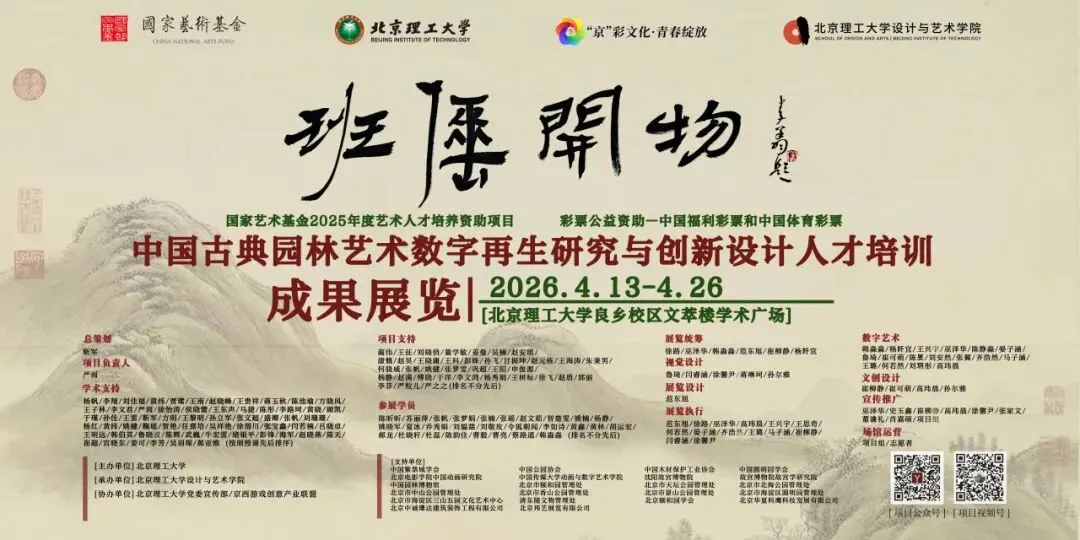 北京理工大学中国文化数字再生项目团队以“班倕开物”为精神指引,积极开展国家艺术基金 2025 年度艺术人才培训资助项目“中国古典园林艺术数字再生研究与创新设计人才培训”。项目聚焦数字园林前沿领域,组建了来自清华大学、北京大学、故宫博物院等顶尖机构的多学科导师团队,以多学科交叉融合为核心理念,系统开设园林艺术理论、数字艺术前沿与创新设计实践三大模块课程。自2025年6月启动以来,项目完成 31天集中授课、48场专家讲座、8场地实调研、5个月的线上设计学习与数十次设计辅导,最终汇聚成今天30余组设计成果。这些作品凝聚着全国高校学员们的智慧与汗水,也展现了北京理工大学在数字园林艺术与设计教育领域的探索积淀。