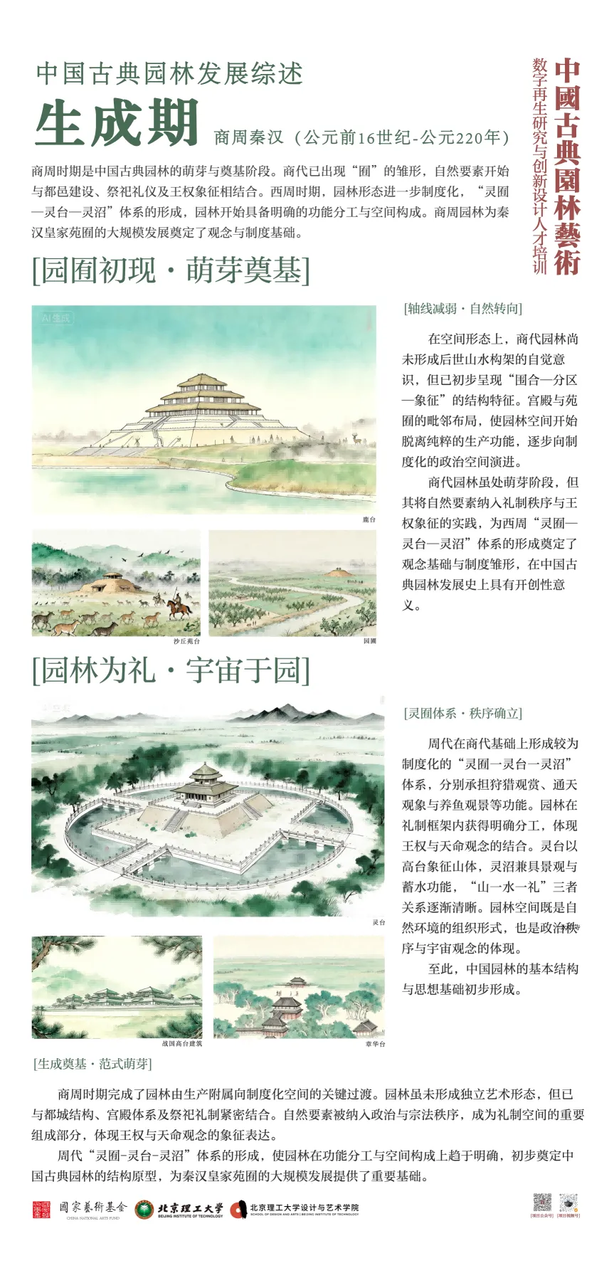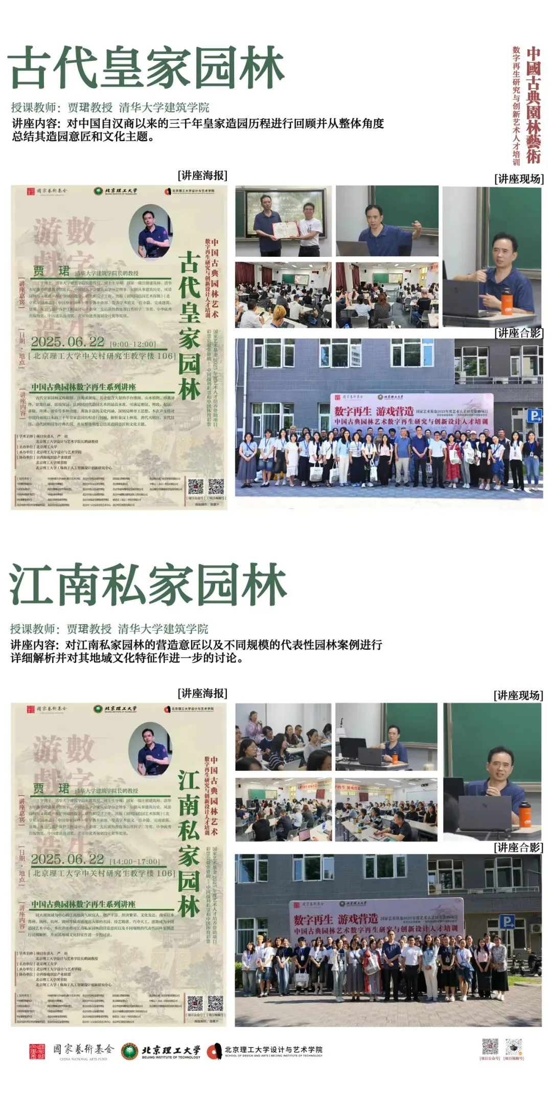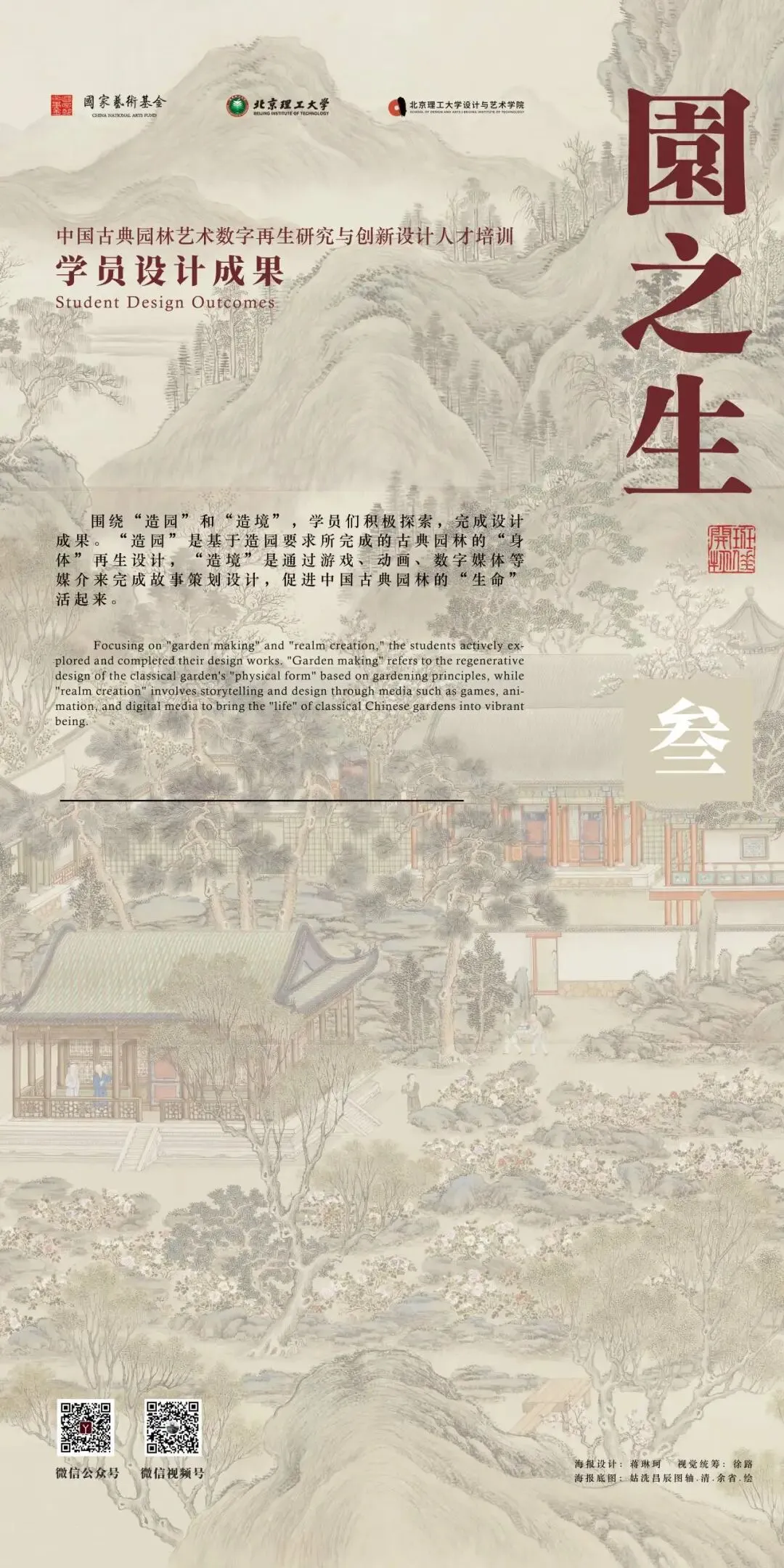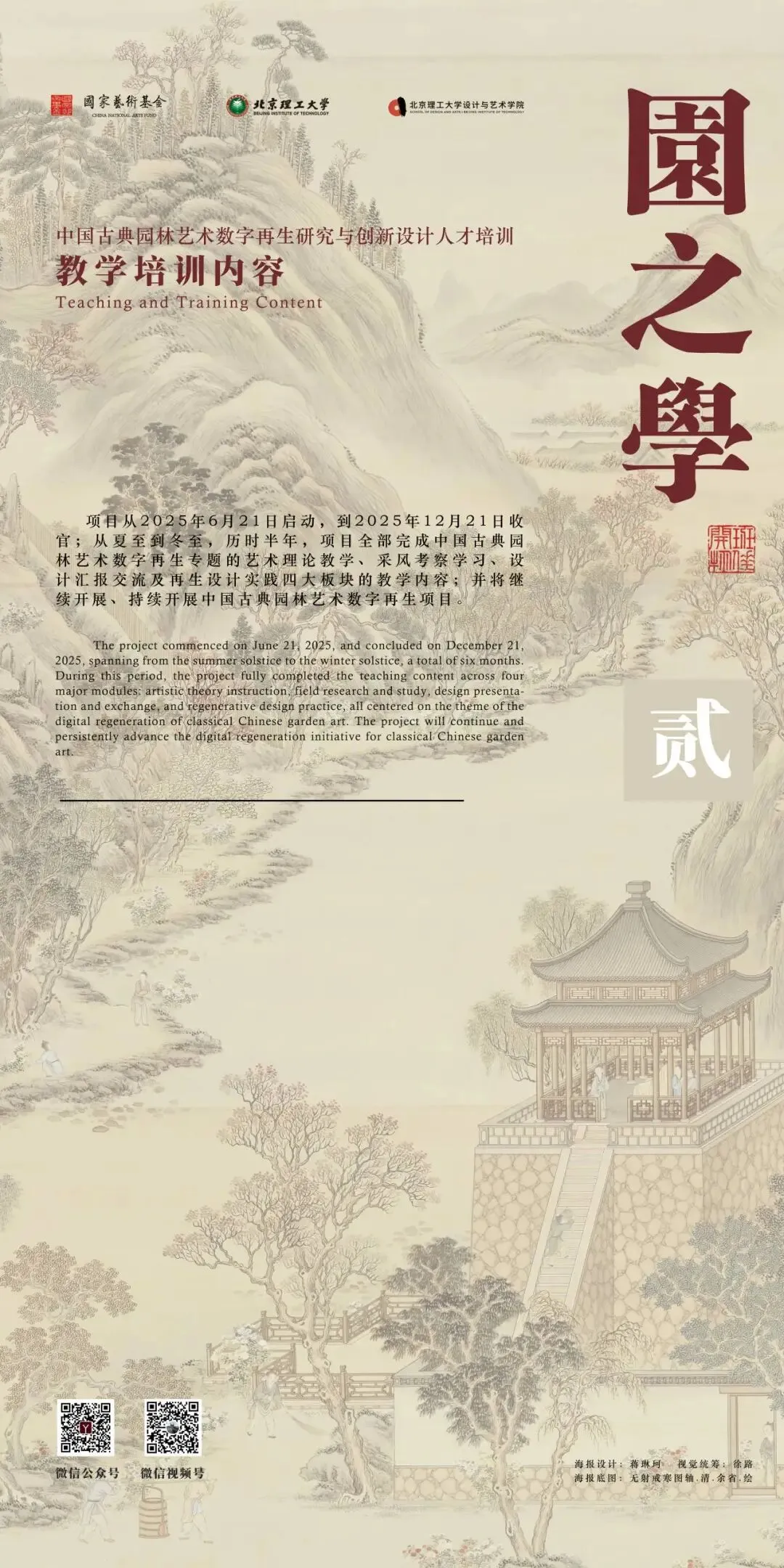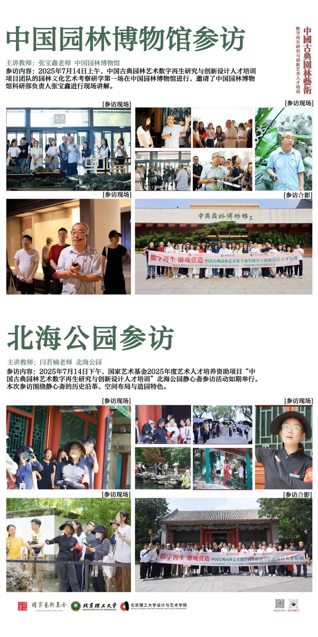 北京理工大学中国文化数字再生项目团队以“班倕开物”为精神指引,积极开展国家艺术基金 2025 年度艺术人才培训资助项目“中国古典园林艺术数字再生研究与创新设计人才培训”。项目聚焦数字园林前沿领域,组建了来自清华大学、北京大学、故宫博物院等顶尖机构的多学科导师团队,以多学科交叉融合为核心理念,系统开设园林艺术理论、数字艺术前沿与创新设计实践三大模块课程。自2025年6月启动以来,项目完成 31天集中授课、48场专家讲座、8场地实调研、5个月的线上设计学习与数十次设计辅导,最终汇聚成今天30余组设计成果。这些作品凝聚着全国高校学员们的智慧与汗水,也展现了北京理工大学在数字园林艺术与设计教育领域的探索积淀。