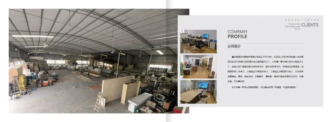 重庆服满荣会服务有限公司成立于2014年,公司法人2003年开始进入北京展览行业2010年在北京东窑村成立展览制作工厂,公司是一家以制作为中心的制作工厂,目前公司厂房面积室内4000余平米,室外3000余平米,拥有独立的烤漆房,现有固定员工30余工龄超过10年的20余人,工龄超过5年的有15余人,公司业务涵盖展台,美陈,商业活动,长期展厅,博物馆,房地产商业包装开业活动,车展巡展,文化建设等