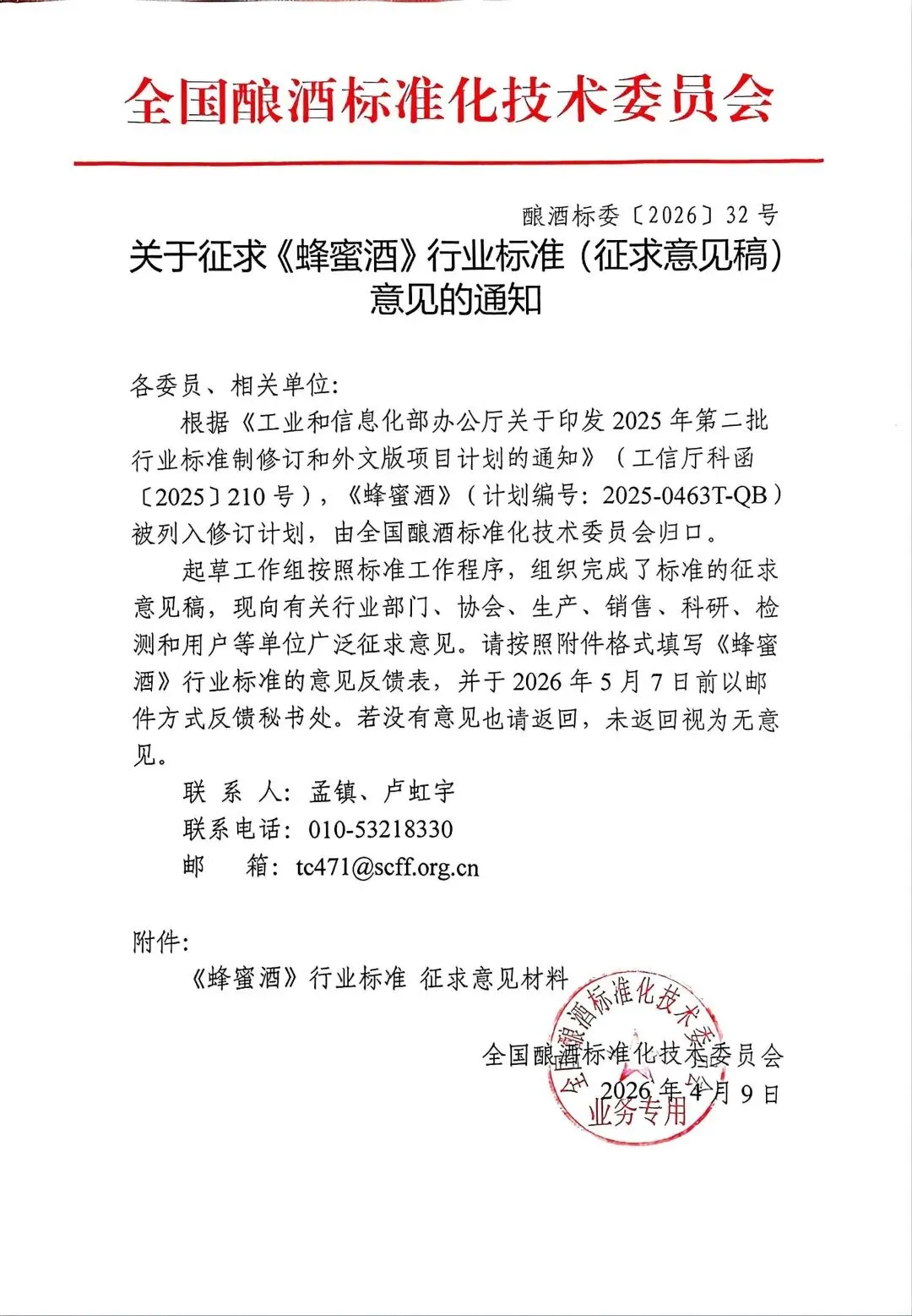 关于征求《 蜂蜜酒》行业标准(征求意见稿)意见的通知