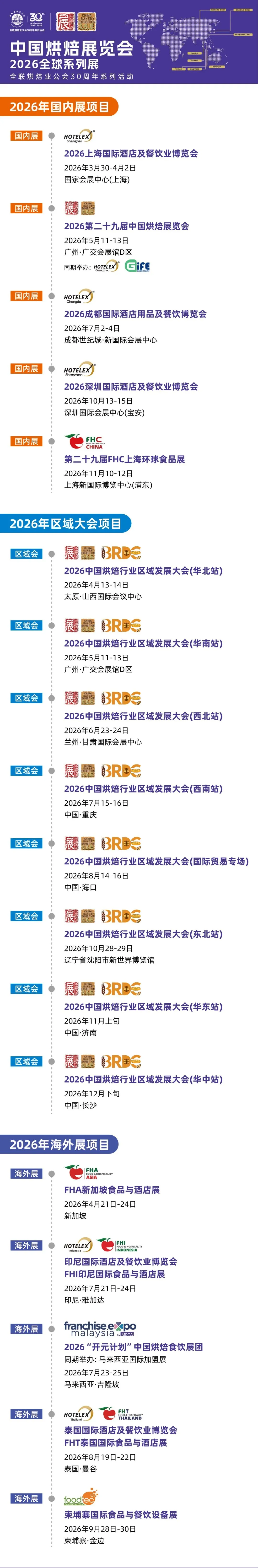 2026年正值中国烘焙行业高质量发展30周年,作为行业开年首场“烘焙+”盛会,本届将同期举办“中国烘焙行业高质量发展30周年庆典”系列活动,全面展示中国烘焙产业三十年辉煌成就与创新突破。