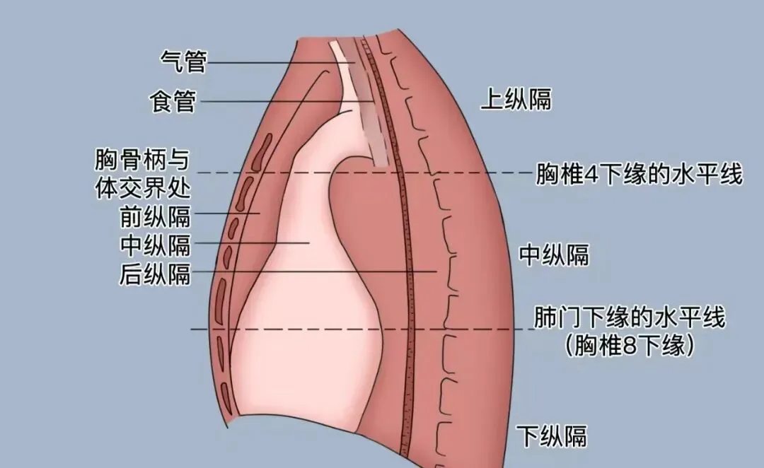 纵隔,就是左右两肺之间的那一片区域。而上纵隔,则是这片区域的最上面那一层。