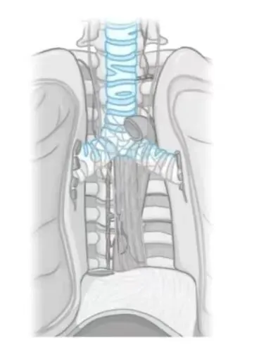 · 食管:食物吞咽后,经过胸腔入口,沿着脊柱前方、气管后方下行,穿过上纵隔去往胃里。