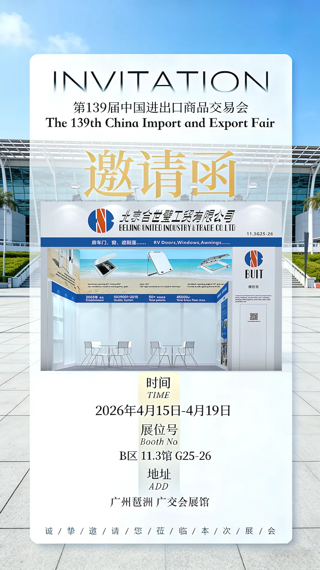 2026年4月15日,被誉为“中国第一展”的139届中国进出口商品交易会(广交会)在广州琶洲会展中心盛大开幕。北京合世璧工贸有限公司(以下简称“合世璧”)携旗下全系列房车零部件精品,重磅亮相本届展会第一期,以专业实力与创新产品,与全球客商共探房车配件行业新机遇。