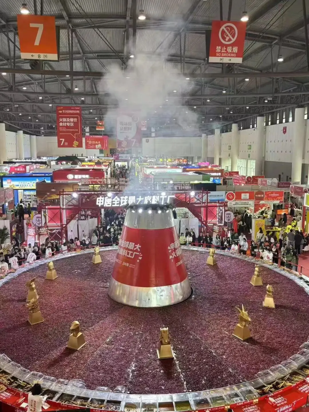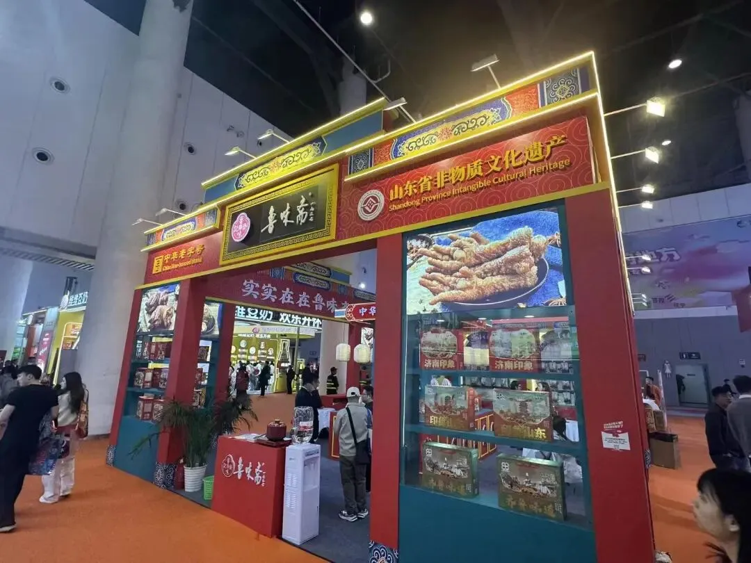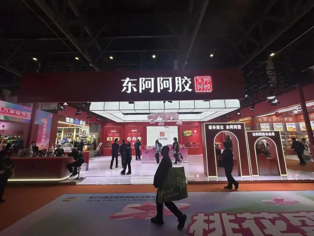 本届糖酒会令所有人印象深刻的不仅有“世界最大火锅”。吸引了无数观众驻足、拍照、排队体验。 而且还有其他众多展台搭建体现出巧思,两大山东品牌展台,就展现了传统与现代融合的会展设计魅力。“鲁味斋”巧用仿古门头、红金配色及非遗标识,营造沉浸式文化氛围,结合LED大屏与试吃区,实现“可看可尝可买”的体验式营销;“东阿阿胶”则以深红主调搭配桃花元素与现代灯光,通过拱门造型与分区布局打造年轻化、高端化的互动空间,兼具视觉冲击与社交传播属性。两者均以场景化设计强化品牌认知,精准触达目标人群,是传统品牌在会展中实现文化传承与市场突围的典范。这一展位让众多会展协会的学子们看到了会展策划中“事件思维”的强大力量。通过制造极致化的场景体验,展位本身成为了话题中心与传播载体,实现了品牌曝光与用户参与的双赢。协会成员深受启发:在信息过载的时代,会展的核心竞争力之一,正是守正创新。同时这也让众学子深刻领悟到,创新是会展行业的核心竞争力,唯有不断突破常规,结合文化与创意打造特色内容,才能让展会更具吸引力与影响力。