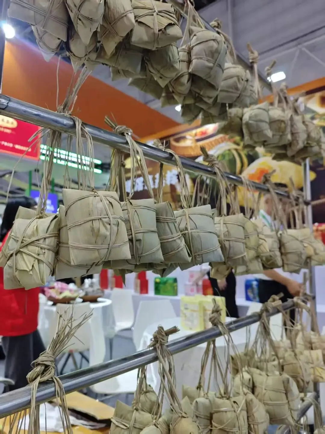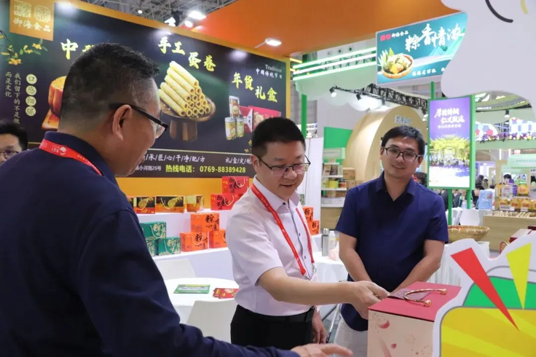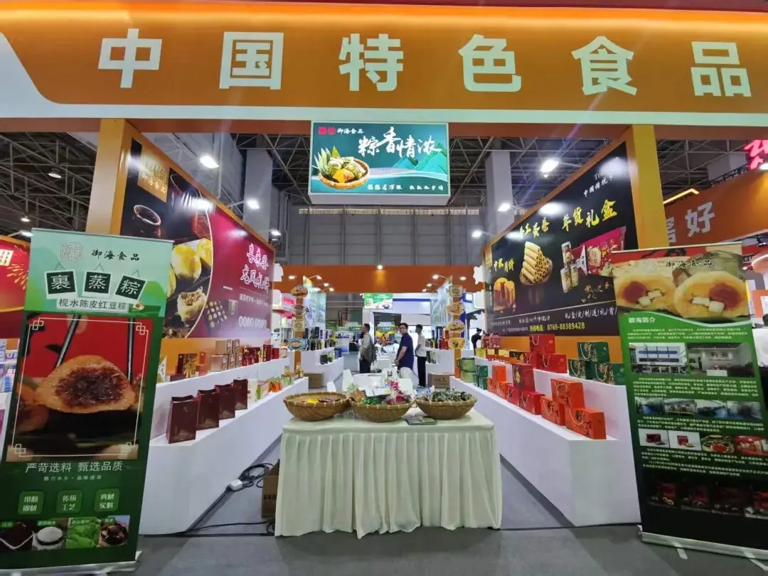 此外,其他参展企业也各具亮点:蜂乜带来了各式蜂蜜饮品,主打健康养生概念;御海食品展出了道滘粽、蛋卷、礼饼等传统小吃,传递地道水乡风味;云品家则带来了一系列助农特色食品等;佳佳美作为道滘传统美食的代表,现场呈现了道滘裹蒸粽等非遗美食,让客商近距离感受水乡传统风味。