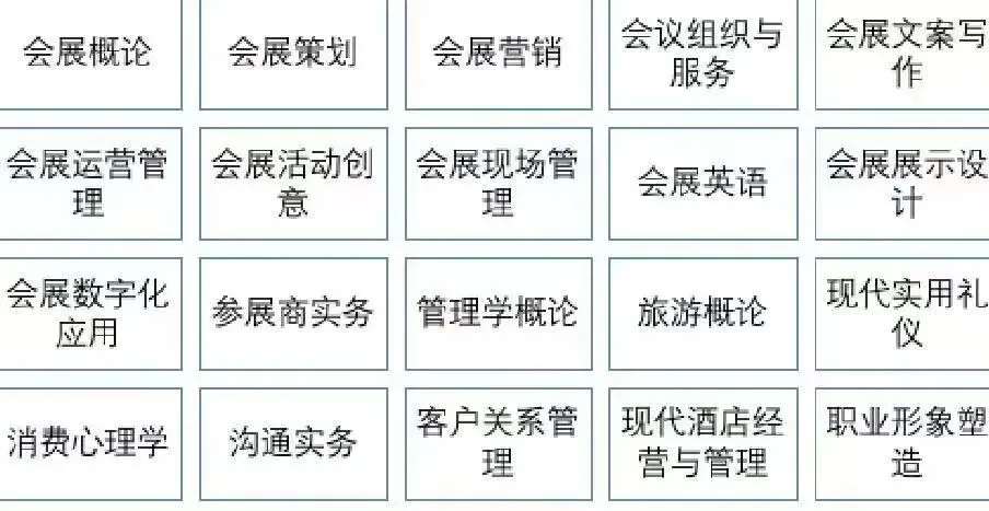 本专业课程体系从学生的能力构成出发,参照行业人才需求现状进行设置,专业课程包括现代实用礼仪、沟通实务、客户关系管理、旅游概论、现代酒店经营与管理、客源国概况、管理学原理、应用经济学、会展概论、会展展示设计、会展策划、会展数字化应用、会议组织与服务、会展活动创意、消费心理学、会展运营管理、会展现场管理、会展英语、参展商实务、公共关系、职业形象塑造、茶文化概论等。