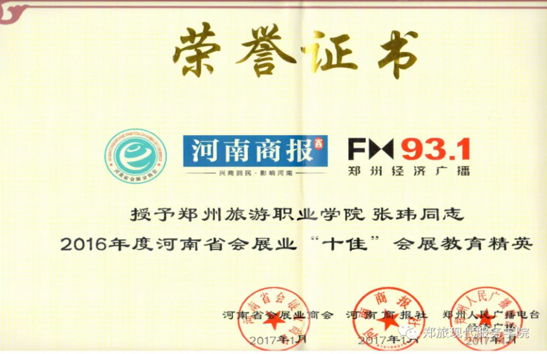 会展专业张玮老师获得 “2016年度十佳会展精英”荣誉称号