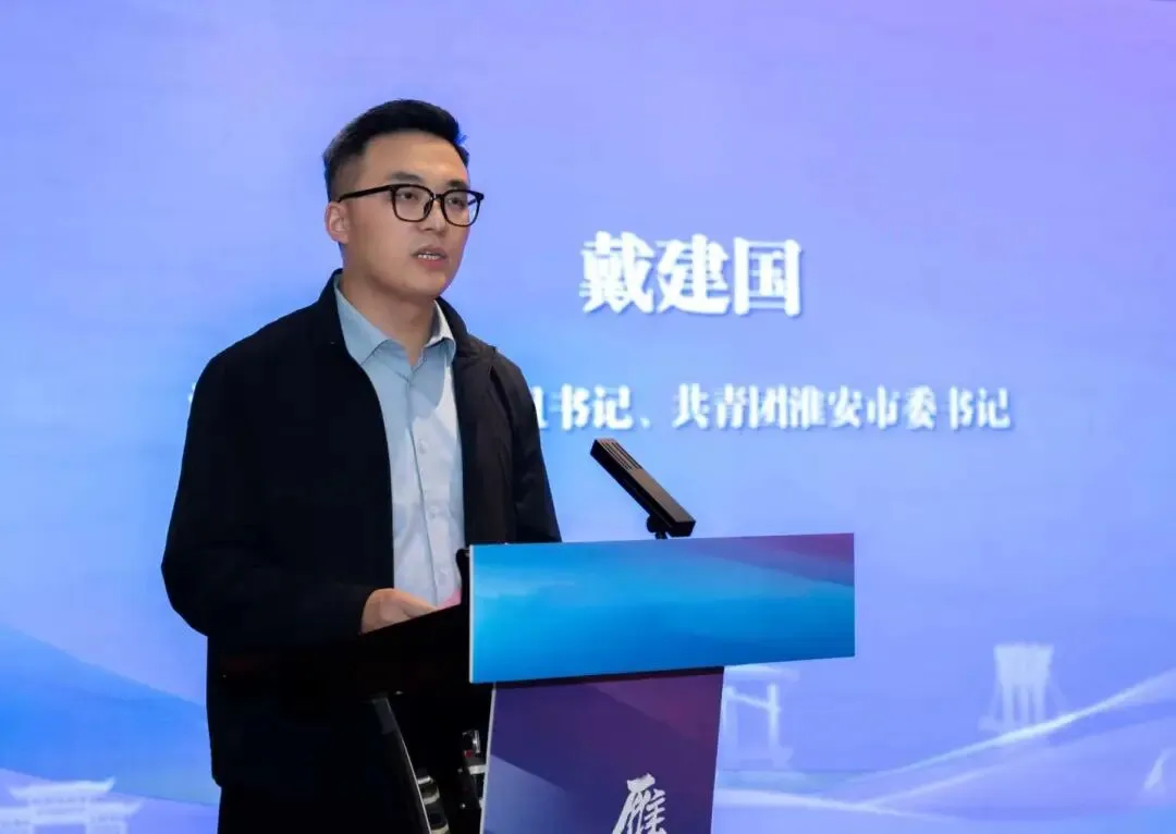 戴建国致辞,他表示共青团始终是青年的“娘家人”,尽心尽力为青年优政策、搭平台,用心用情为青年强服务、细保障,在就业创业、实习实践等方面提供有力支持,希望青年学子心系故土、学成归淮,在家乡施展才华、实现理想。