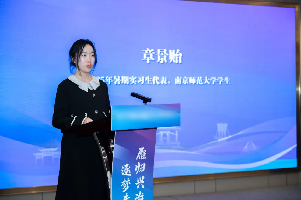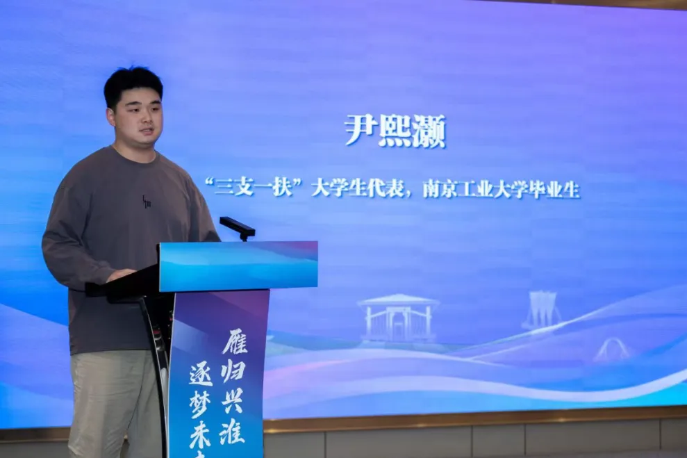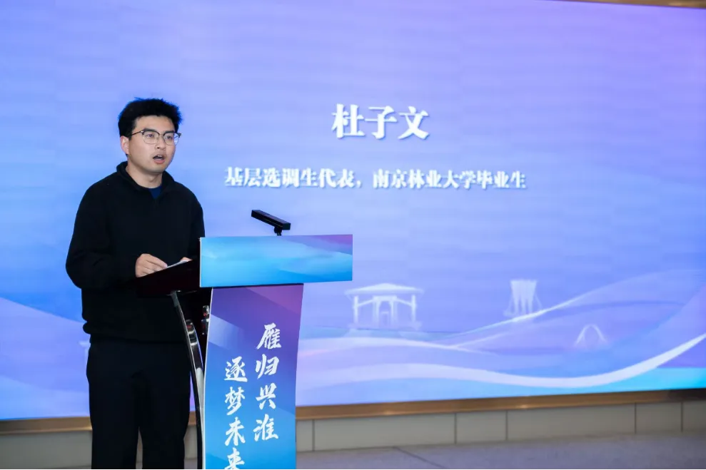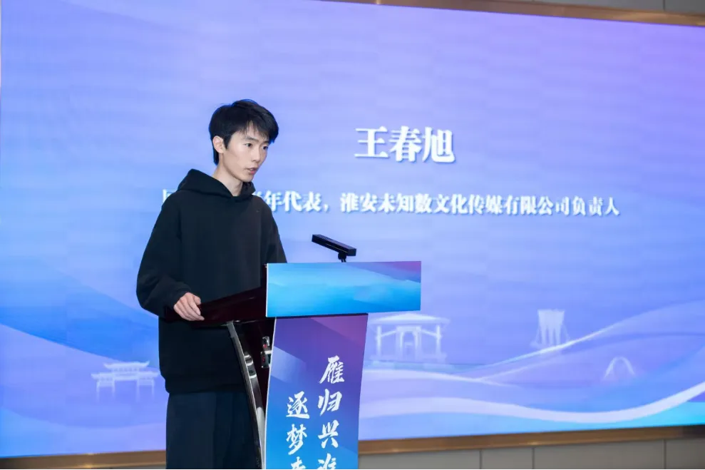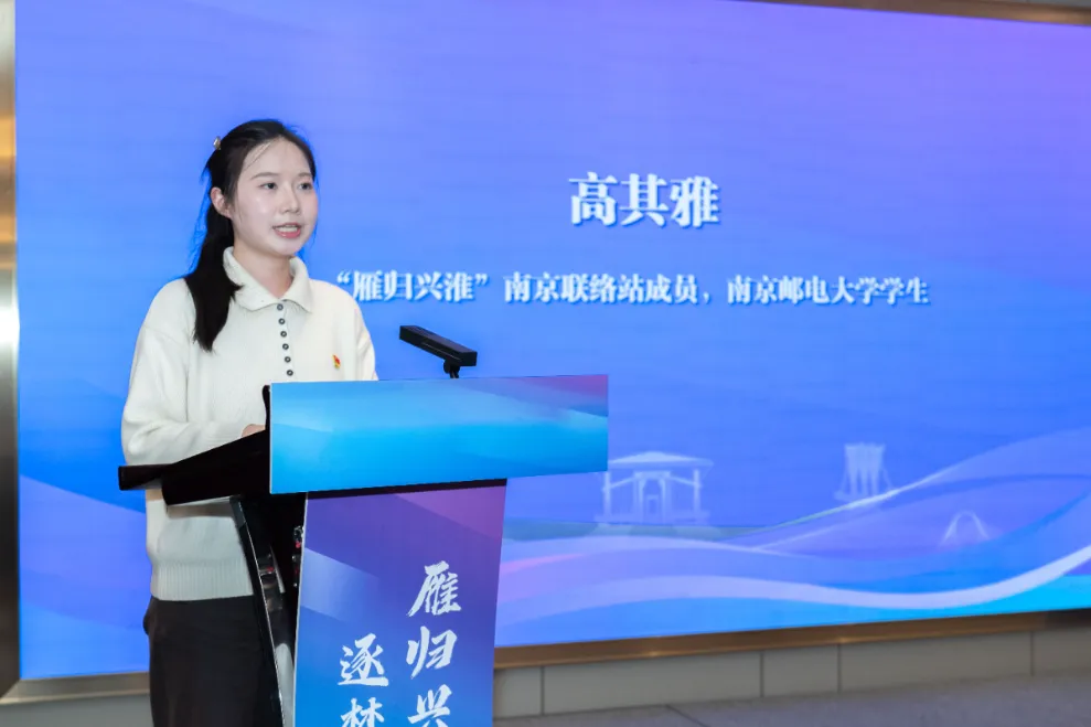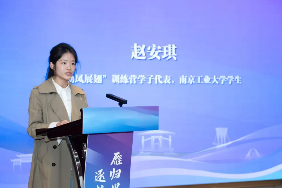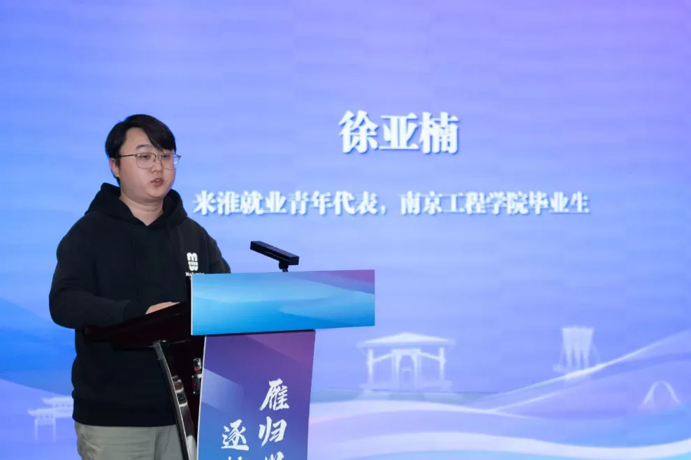 “雁归兴淮” 南京联络站成员、南京邮电大学学生高其雅,2025 年暑期实习生代表、南京师范大学学生章景贻,“助凤展翅” 训练营学子代表、南京工业大学学生赵安琪,来淮就业青年代表、中天钢铁员工、南京工程学院毕业生徐亚楠,回淮创业青年代表、淮安未知数文化传媒有限公司负责人王春旭,基层选调生代表、南京林业大学毕业生杜子文,“三支一扶” 大学生代表、南京工业大学毕业生尹熙灏分别作了交流分享,号召更多学子关注家乡、回归家乡、建设家乡。