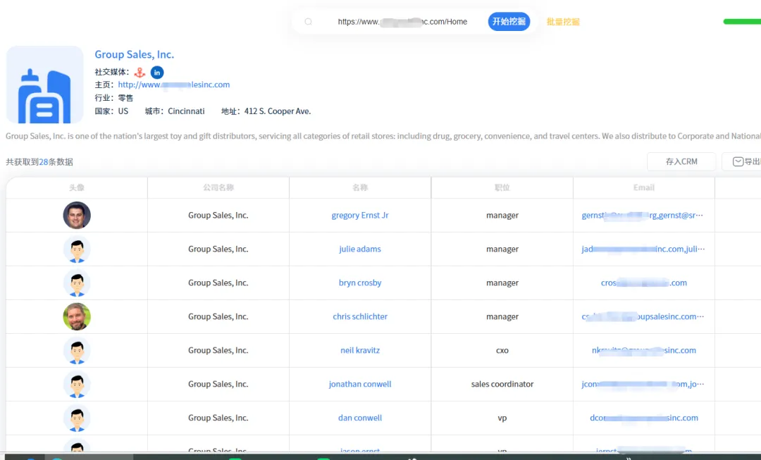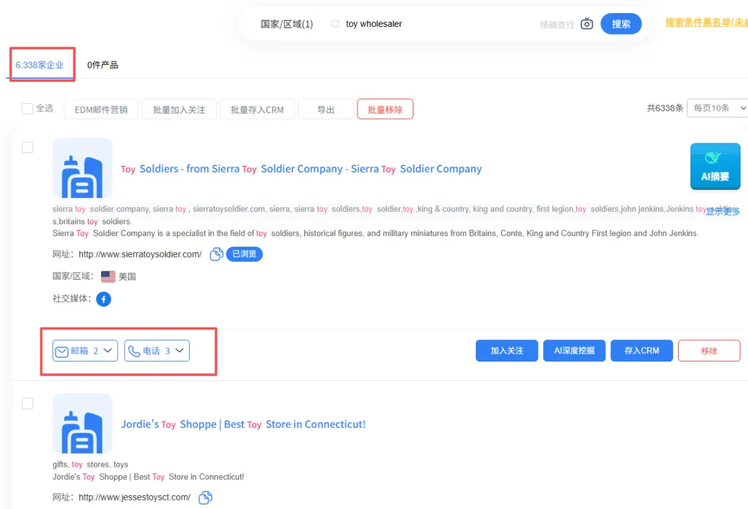 系统自动找到玩具的客户,采集出邮箱