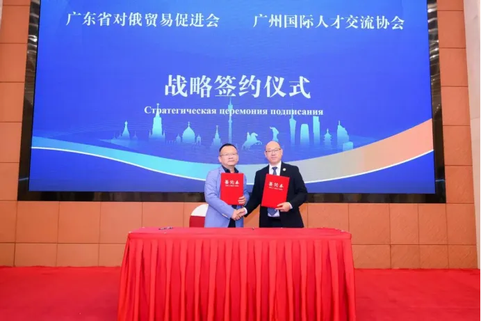 会议期间,广东省对俄贸易促进会与广州国际人才交流协会达成战略合作并举行签约仪式。双方将共同成立广州国际人才交流协会国际产教融合创新发展专委会,共同助力大湾区中俄经贸人才高质量发展,为中俄企业互通往来提供人才支撑,双方将以此合作为新起点,持续深耕对俄经贸与教育合作,不断创新服务模式,为推动粤俄新时代全面战略协作伙伴关系深入发展、助力粤港澳大湾区建设贡献新的更大力量。