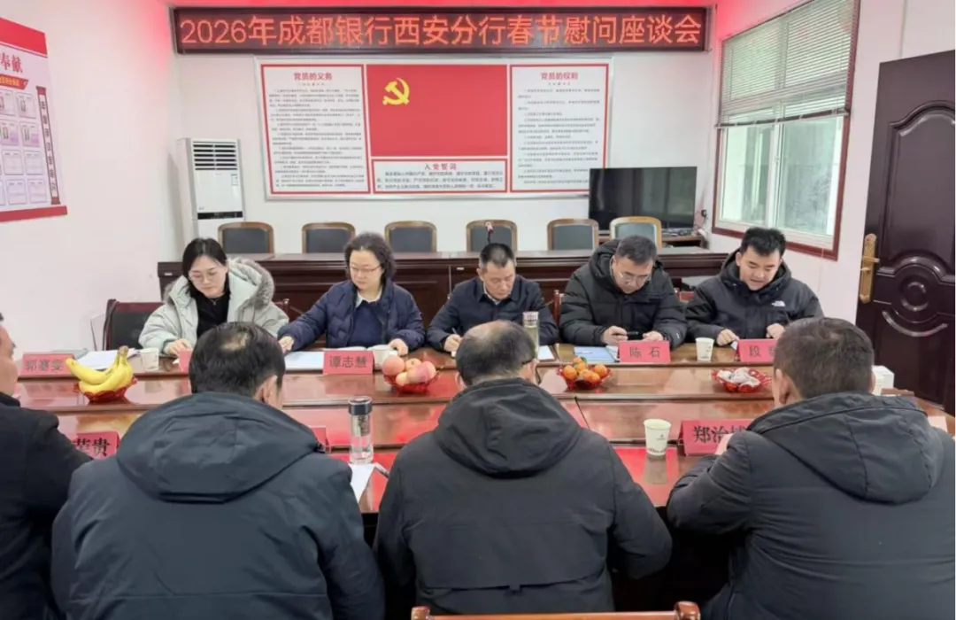 2月4日,成都银行西安分行党委书记、行长谭志慧,纪委书记陈忠麟一行专程赴青梅村开展春节慰问暨茶话座谈活动,向村民送去米、面、油及300份新春福袋,以实际行动传递金融温度与新春祝福。