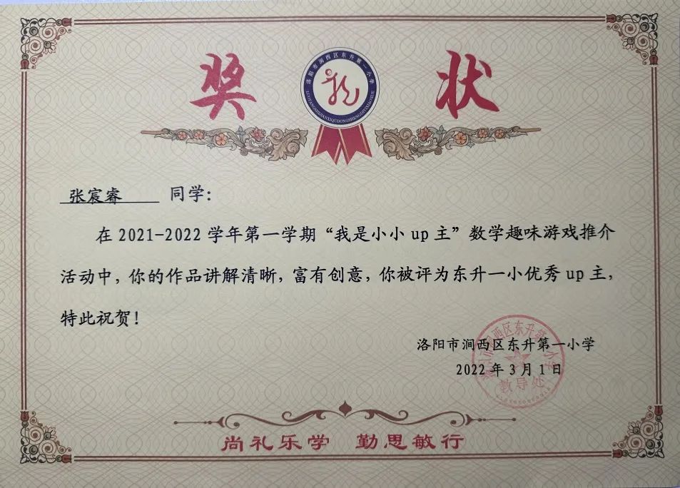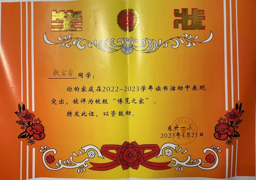 腹有诗书气自华,最是书香能致远。通过大量阅读的积累,张宸睿同学开阔了视野,增加了自信,在2022年“我是小小Up主”推介活动中被评为“优秀Up主”,2023年张宸睿家庭还被评为了校级“博览之家”。
