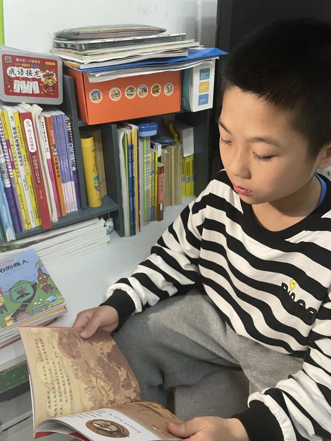 阅读氛围的营造为阅读习惯的养成提供了良好的条件。张宸睿同学家里,书桌旁、沙发旁、床头柜上都会放一些书,这样他想看的时候随手就可以拿到。在悠闲的假日亦或是在宁静的夜晚,张宸睿同学专注地坐在他的书桌前,选一本自己喜欢的书细细品味,在书中汲取知识,享受快乐。