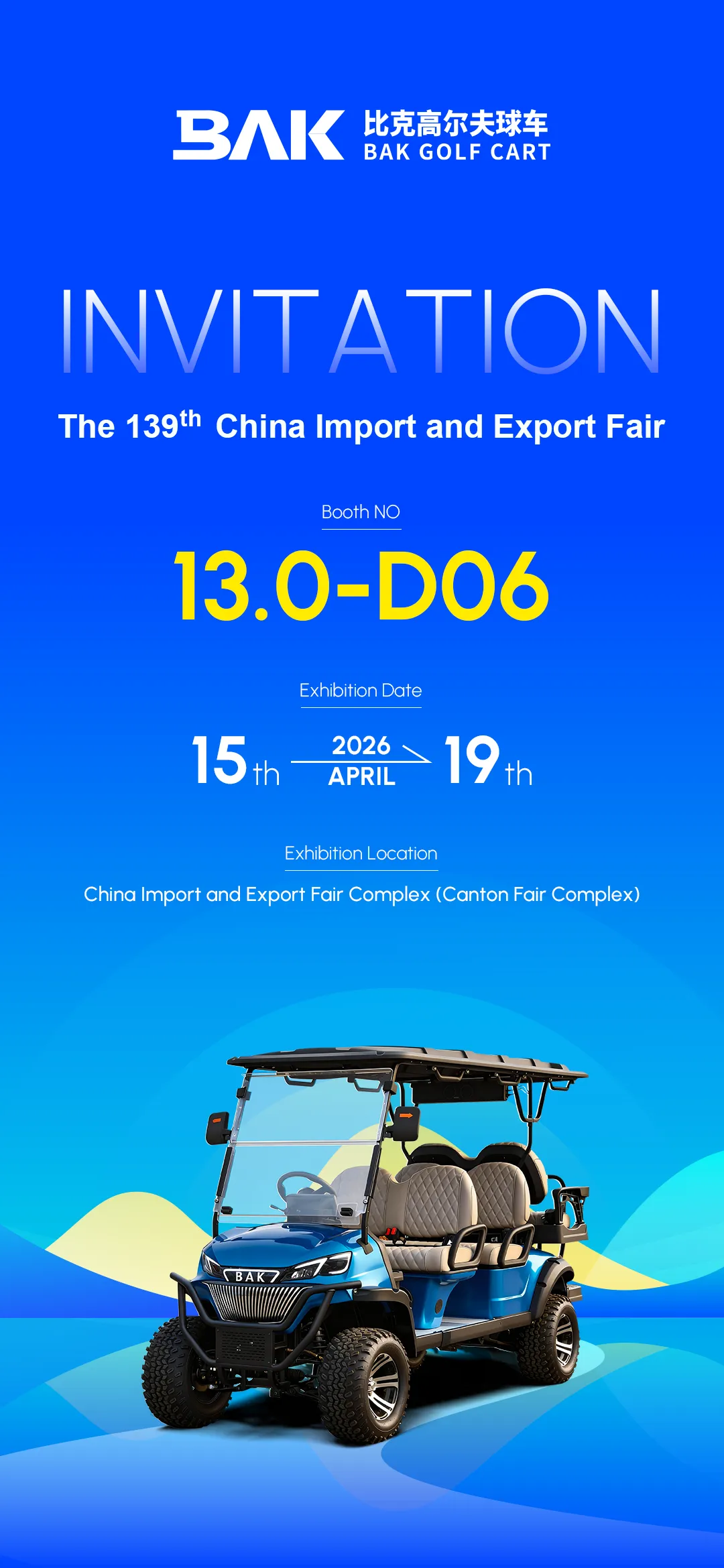 在全球贸易持续发展的背景下,作为中国重要的国际贸易平台之一,中国进出口商品交易会(广交会)持续为企业与全球市场搭建高效沟通的桥梁。2026年4月,BAK将携旗下高尔夫球车及锂电解决方案,亮相第139届广交会,向来自全球的客户展示我们的产品与制造能力。