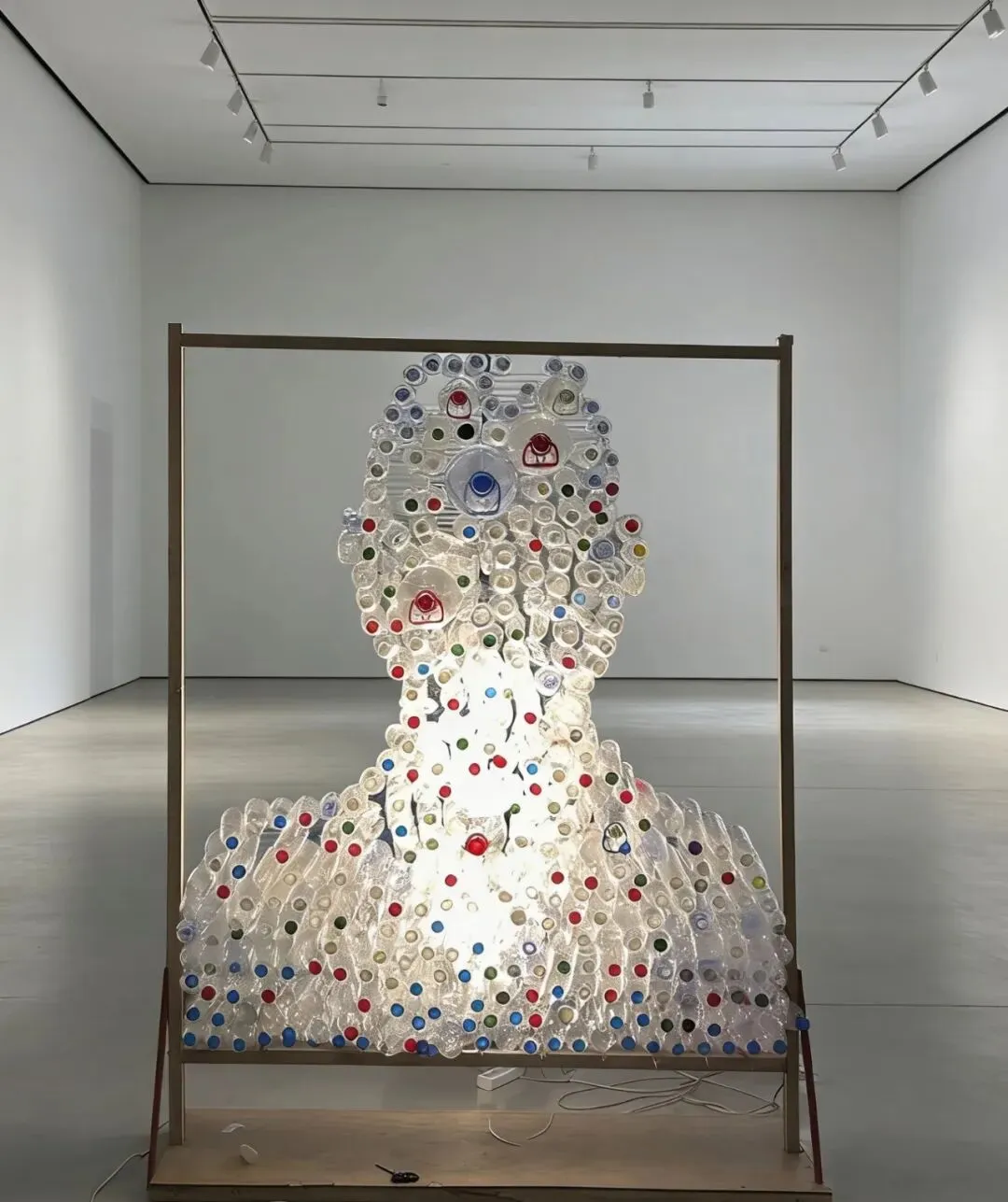 作品简介:本作品通过回收塑料瓶构建视觉空问。影像映射在肖像装置上以此隐喻消费主义对个体的淹没。在”匆匆"的流逝与康价物质的堆积中,反映当代快消⽣活对⾃然与现实⽣活本身和精神世界的双重掠夺。