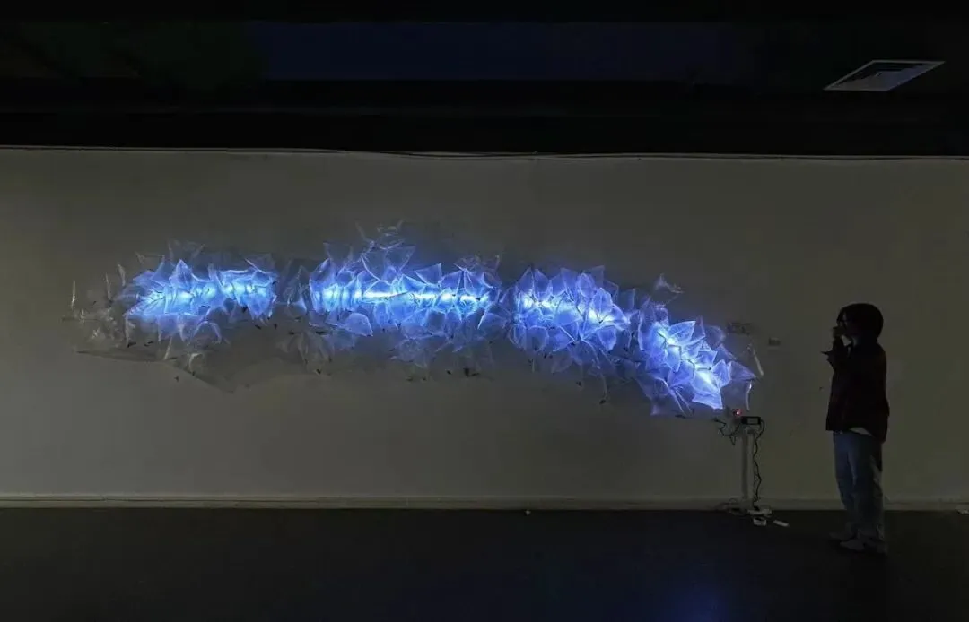 作品简介:呼吸,是⽣命最原始的馈赠,也是最不经意的消耗。当你对着装置吹⽓,那些本已死去的废弃物被你的⽣命体征瞬间“点燃”。光亮在塑料的褶皱问游⾛,呈现出⼀种病态⽽冷静的⽩⾊律动。我们的每⼀次呼吸,究竟是在延续⽣命,还是在加速⼀场关于消耗的倒计时?